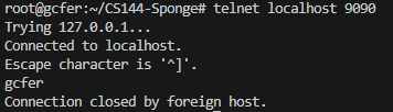 再开另一个终端输入telnet localhost 9090,此时两个终端就通过localhost:9090建立了可靠的字节流。此时在一端输入什么,另一端会同步出现(需要回车去结束你的输入)。最后用ctrl + C结束服务器端,客户端也会结束。