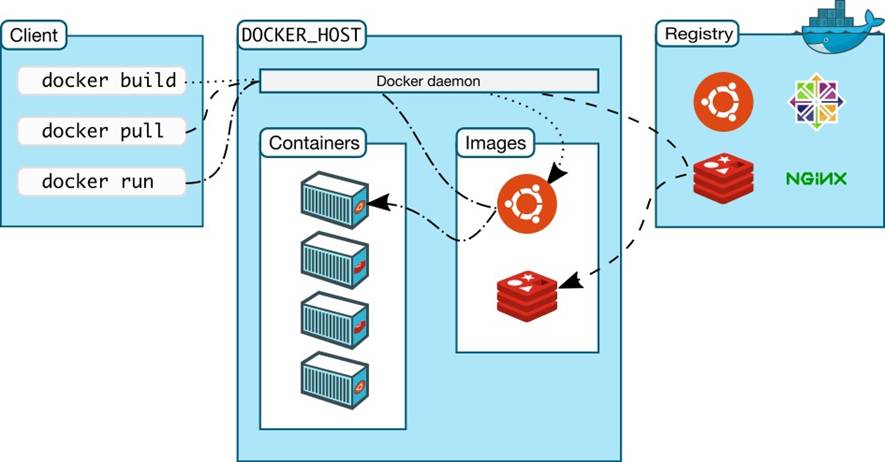 Docker是一个客户端-服务端(C/S)架构程序,Docker客户端只需要向Docker服务端或者守护进程发出请求,服务端或者守护进程完成所有工作返回结果,Docker提供了一个命令行工具Docker以及一整套的**Restful API**,可以在同一台宿主机器上运行Docker守护进程或者客户端,也可以从本地的Docker客户端连接到运行在另一台宿主机上的远程Docker守护进程