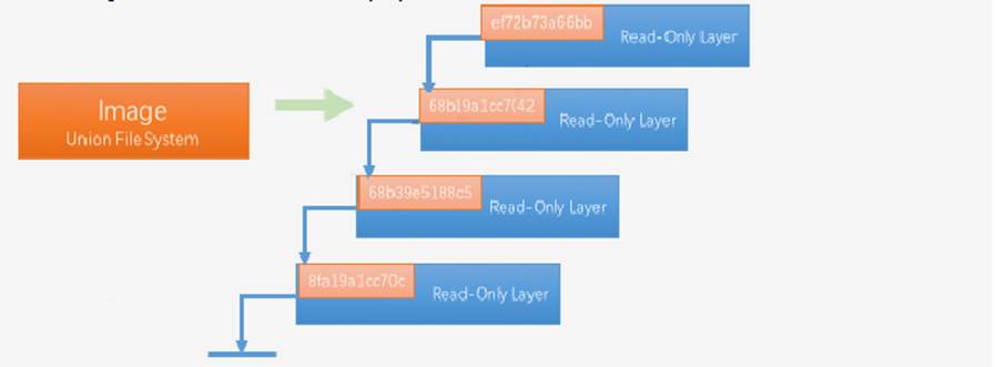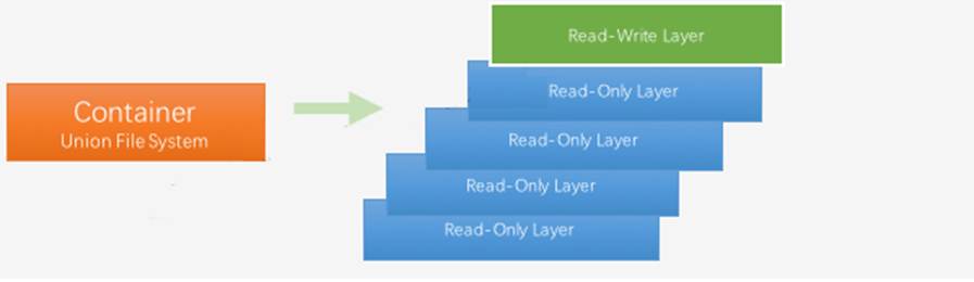 右边我们看到了多个**只读层**,它们重叠在一起。除了最下面一层,其它层都会有一个指针指向下一层。这些层是Docker内部的实现细节,并且能够在docker宿主机的文件系统上访问到。统一文件系统(Union File System)技术能够将不同的层整合成一个文件系统,为这些层提供了一个统一的视角,这样就隐藏了多层的存在,在用户的角度看来,只存在一个文件系统。