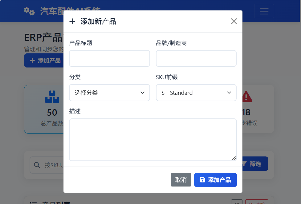 只需输入产品标题(如 “刹车片”)、基本描述(如 “刹车片套装”)、品牌 / 制造商(如 “本田”)及SKU 前缀,系统即可自动生成: