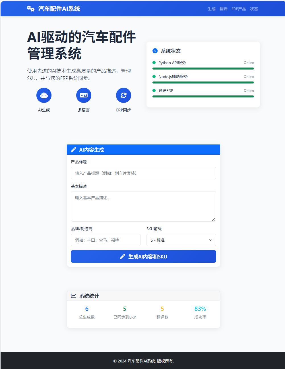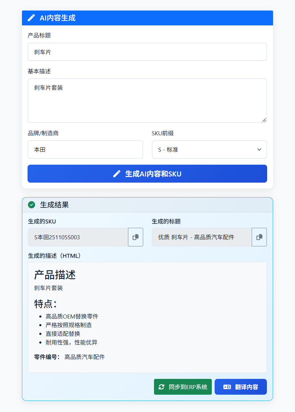 汽车配件 AI 系统以 “AI 内容生成 + 多语言翻译 + ERP 产品管理” 为核心,实现从产品信息创建到多语言适配,再到库存与 ERP 系统同步的全流程智能化管理。