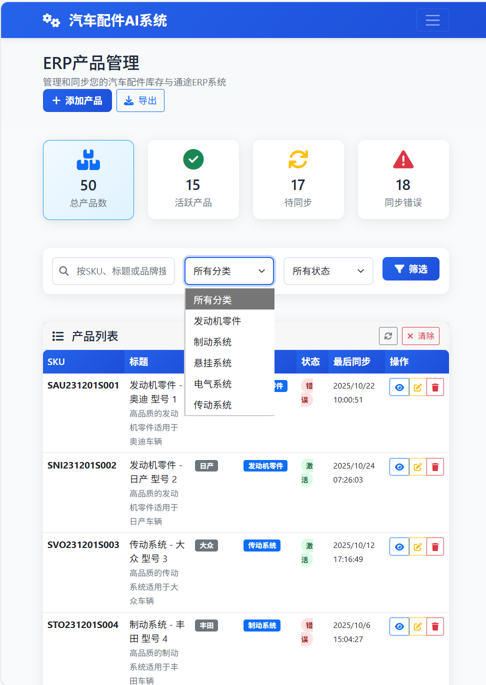 - 精准筛选与分类:可按 “SKU、标题、品牌” 搜索,按 “发动机零件、制动系统、悬挂系统、电气系统、传动系统” 等分类筛选,还能根据 “活跃、错误、待处理” 等状态快速定位产品,大幅提升库存管理效率;
