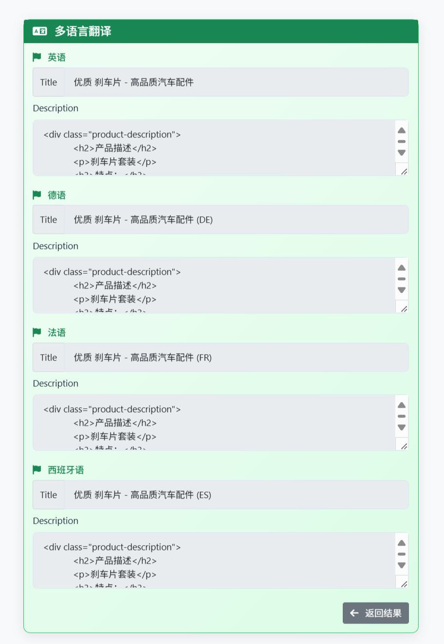 针对汽车配件出口或跨境业务的多语言需求,系统支持英语、德语、法语、西班牙语等主流语种的一键翻译。以 “优质 刹车片 - 高品质汽车配件” 为例,系统可自动生成各语种标题与 HTML 格式的产品描述,帮助企业轻松打通国际市场的语言壁垒,让产品信息在全球范围内精准传递。(注:下图仅为Mock结果,真实场景会调用后端接口得到真实译文。)