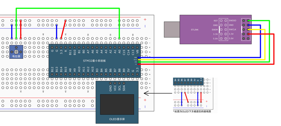 {OLED_Init(); AD_Init(); OLED_ShowString(1, 1, "ADValue:");OLED_ShowString(2, 1, "Voltage:0.00V");while (1){ADValue = AD_GetValue(); //获取AD转换的值Voltage = (float)ADValue / 4095 * 3.3; //将AD值线性变换到0~3.3的范围,表示电压OLED_ShowNum(1, 9, ADValue, 4); //显示AD值OLED_ShowNum(2, 9, Voltage, 1); //显示电压值的整数部分OLED_ShowNum(2, 11, (uint16_t)(Voltage * 100) % 100, 2); //显示电压值的小数部分Delay_ms(100); //延时100ms,手动增加一些转换的间隔时间}