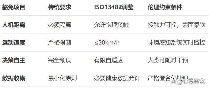 例如,传统工业机器人要求与人类保持绝对隔离,而护理机器人依标准可在力控、速度限制(移动速度≤20km/h)等防护措施到位时,与人类直接互动。这种豁免不是安全妥协,而是基于护理场景特殊性的制度创新——完全隔离将使护理机器人丧失存在价值。