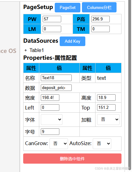 - 数据源与属性管理:支持添加数据源(如示例中的 Table1),并可对每个组件(如文本组件)的名称、数据绑定、尺寸、字体、字号等属性精细配置,实现数据与模板的动态关联,保证信息展示的规范性与个性化。