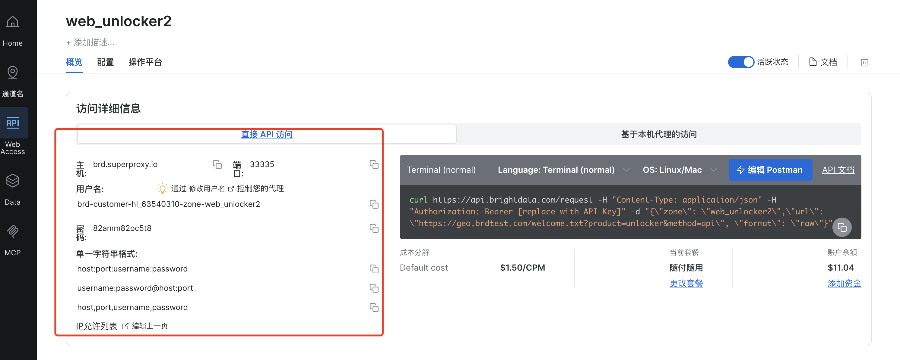 我们可以看到Web Unlocker API 已经创建成功