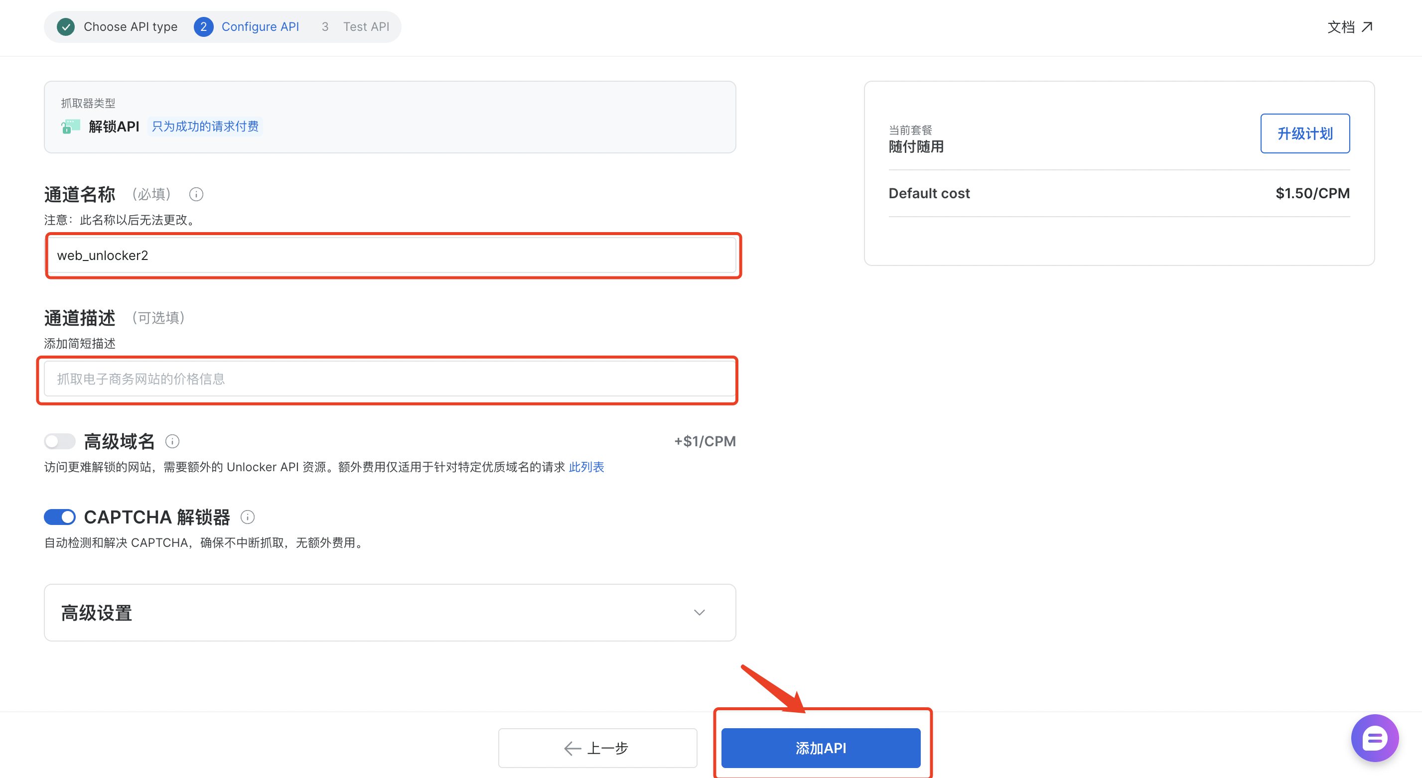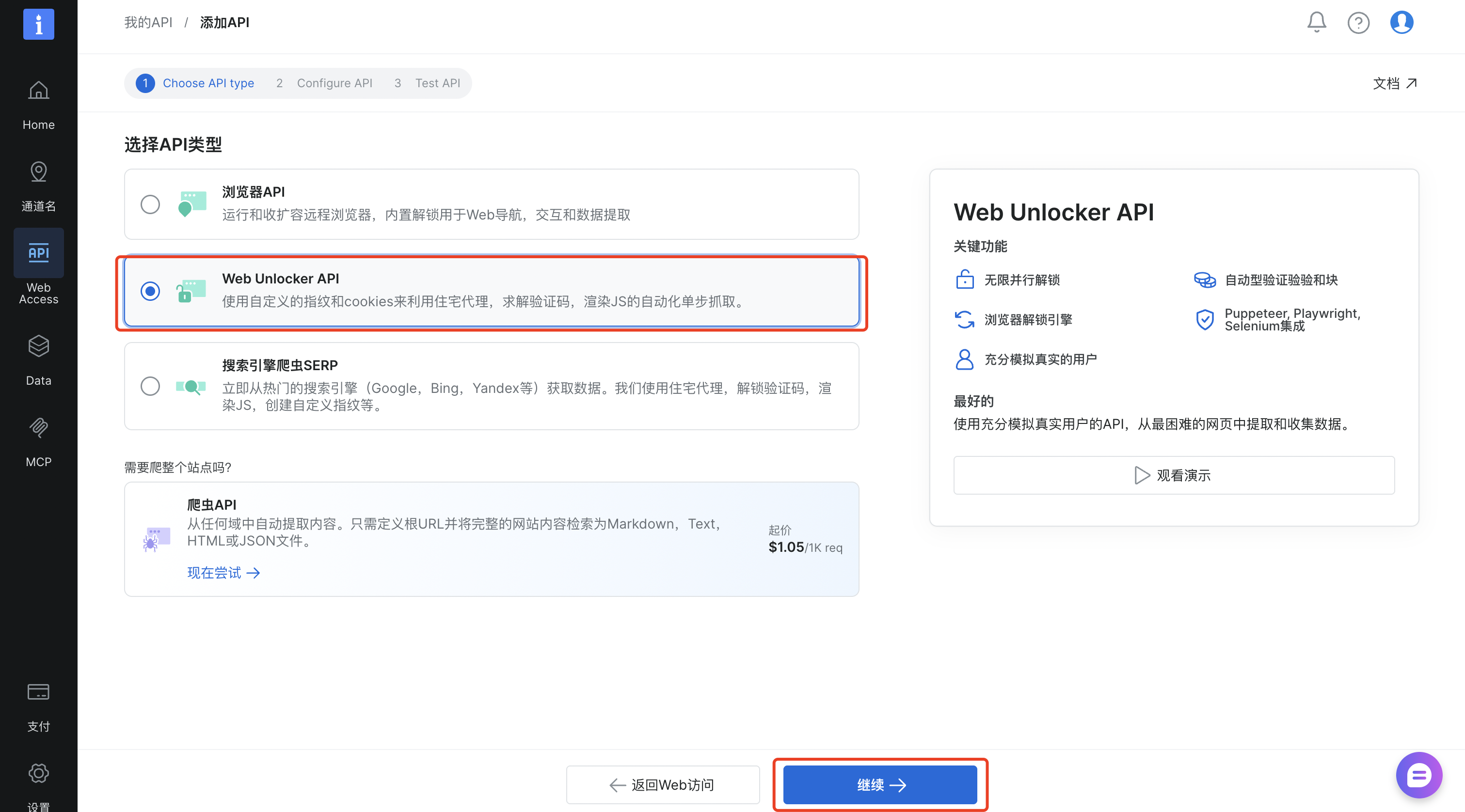 选择Web Unlocker API,其可以使用自定义的指纹和cookies来利用住宅代理,求解验证码,渲染JS的自动化单步抓取。
