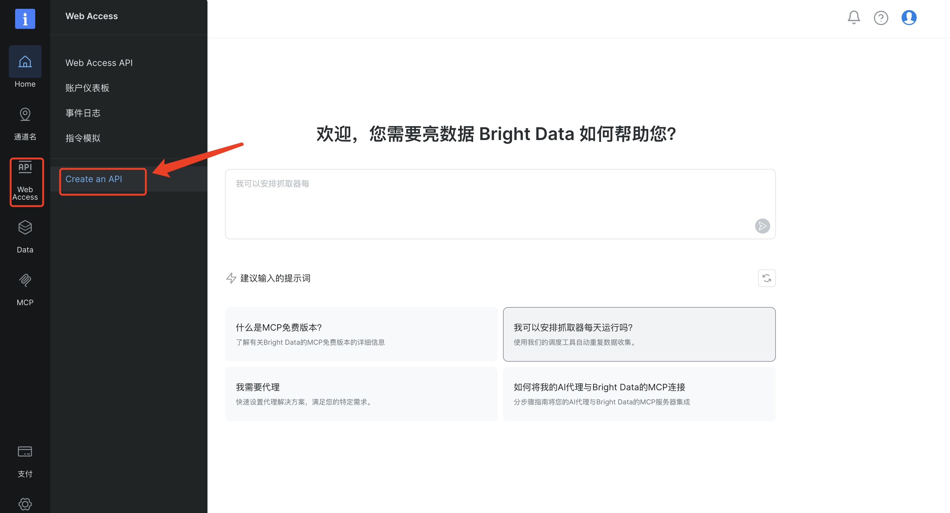 这里我们选择左侧菜单栏中的Web Access,然后点击Create an API