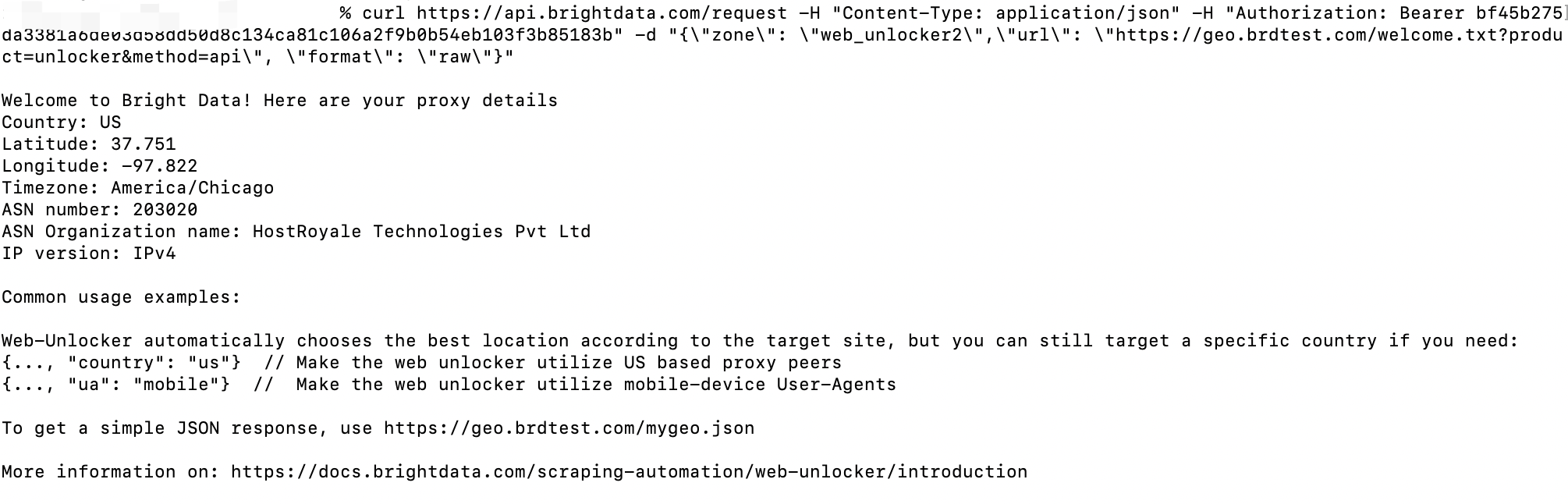 - Authorization: Bearer [INSERT YOUR API key]您的 API 密钥位于您的 Web Unlocker API 区域中。