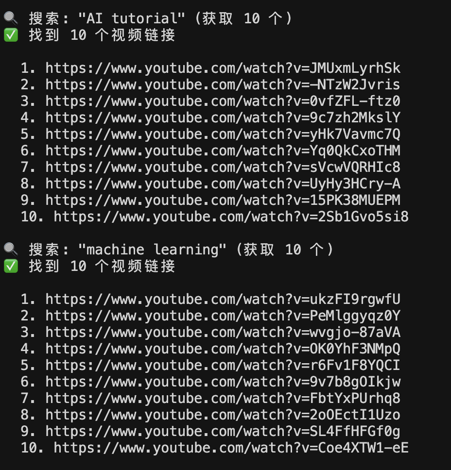 console.log('='.repeat(60) + '\n');// 🎯 配置搜索关键词const searches = [{ keyword: 'AI tutorial', count: 10 },{ keyword: 'machine learning', count: 10 },{ keyword: 'python programming', count: 10 },];let allLinks = [];for (const search of searches) {const links = await searchVideoLinks(search.keyword, search.count);