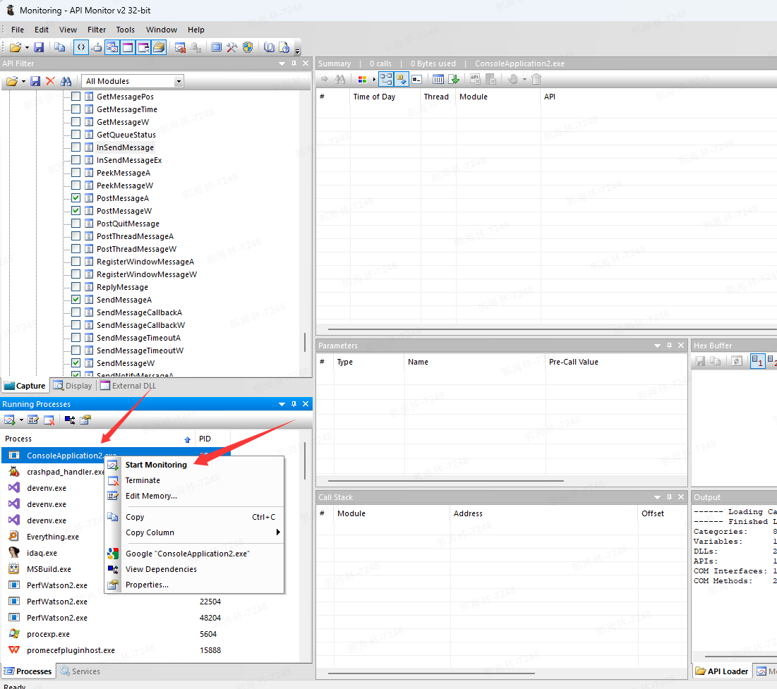 API monitor有32位、64位版本,查看要监听进程的位数,选择对应版本。