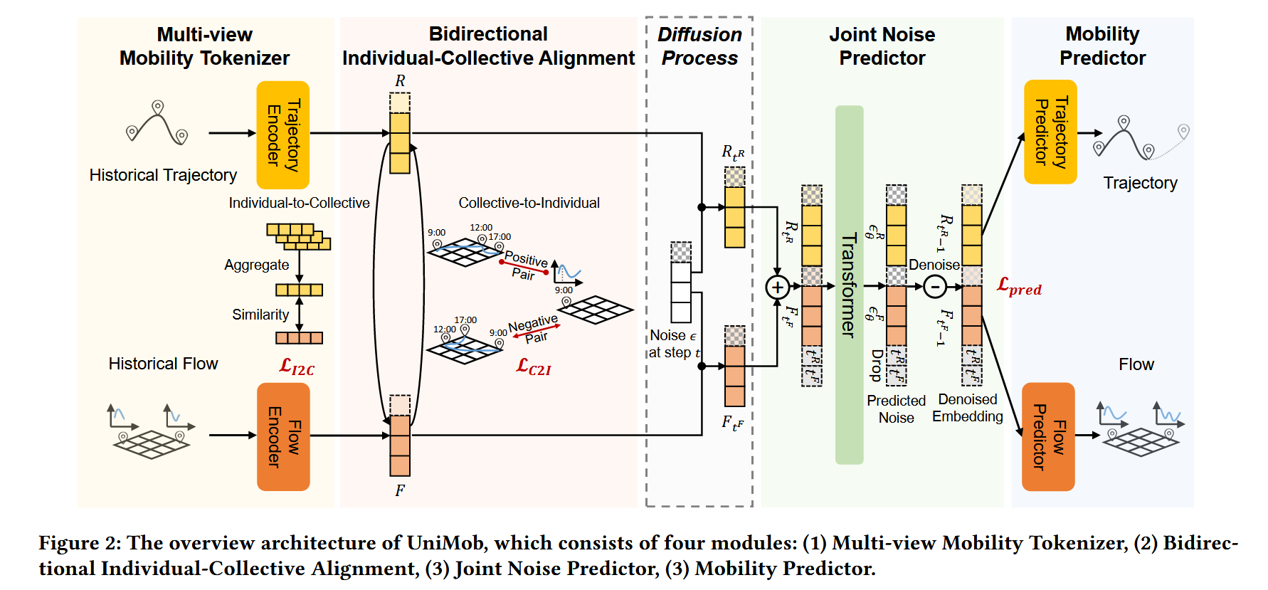 为此,作者设计了一种新的框架,首次实现个体轨迹与人群流动预测的统一,解决了现有模型仅支持单任务的局限。该模型通过多视角移动令牌化器将两种数据转换为统一时空令牌,结合扩散 Transformer 架构建模时空动态,并设计双向个体 - 集体对齐机制(I2C 损失与 C2I 损失)提取共同时空模式,实现两者预测的相互增强。