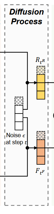 扩散过程用于给数据加噪声,记录下每一步t的噪声值,直到第T步,数据完全模糊。随机采样第t步的噪声与原数据结合,送入下一个环节。