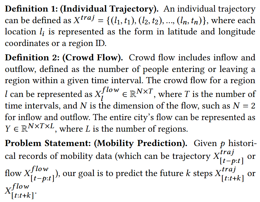 这段是比较好理解的,因此我就不过多说明了。问题定义就是:在我们知道过去一段时间(t-p到t这段时间)的个体轨迹数据或群体流动数据的情况下,预测未来k步之内的个人轨迹数据或群体流动数据。