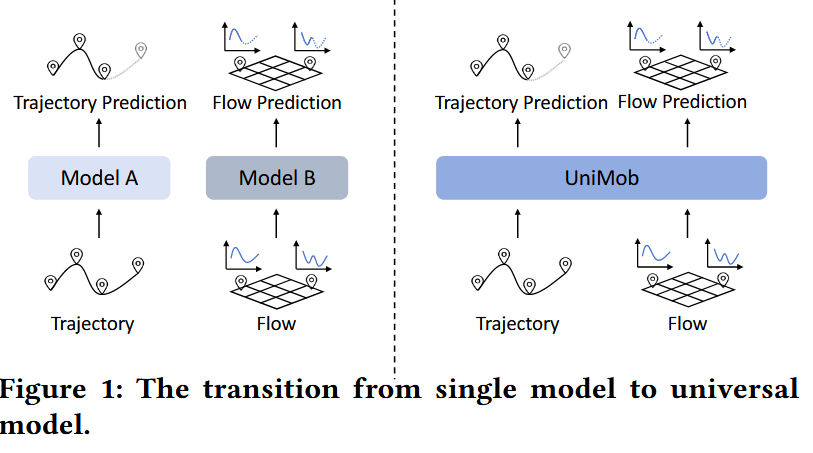 人类移动预测目前主要聚焦于两块:个体轨迹预测和群体流动预测,所有相关研究目前都围绕这两大块中的一块进行,但没有人把这两块合起来一起研究,原因是因为这两类研究的数据格式差别过大,个人轨迹数据主要描述个体某个时间在某个位置,而群体流动数据主要记录某个位置某时间流入流出多少人,因此放在一起研究难度过大。