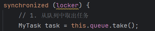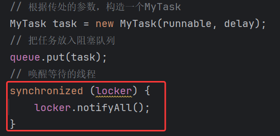 synchronized (locker) {// 1. 从队列中取出任务MyTask task = this.queue.take();// 2. 判断到没到执行时间long currentTime = System.currentTimeMillis();if (currentTime >= task.getTime()) {// 时间到了,执行任务task.getRunnable().run();} else {// 当前时间与任务执行时间的差long waitTime = task.getTime() - currentTime;// 没有到时间,重新放回队列queue.put(task);synchronized (locker) {// 加入等时间locker.wait(waitTime);}}