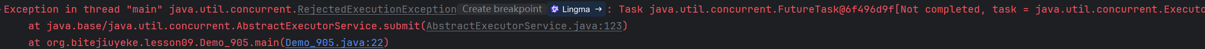 public class Demo_905 {public static void main(String[] args) throws InterruptedException {// 定义一个线程池ThreadPoolExecutor threadPool = new ThreadPoolExecutor(3,5, 1, TimeUnit.SECONDS,new LinkedBlockingQueue<>(5),new ThreadPoolExecutor.AbortPolicy());// 通过循环向线程池中提交任务for (int i = 0; i < 100; i++) {int taskId = i + 1;threadPool.submit(() -> {System.out.println("执行任务:" + taskId + ", " + Thread.currentThread().getName());});}