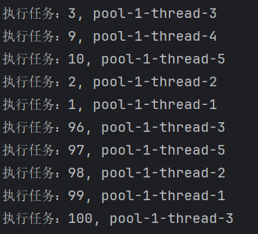 public class Demo_905 {public static void main(String[] args) throws InterruptedException {// 定义一个线程池ThreadPoolExecutor threadPool = new ThreadPoolExecutor(3,5, 1, TimeUnit.SECONDS,new LinkedBlockingQueue<>(5),new ThreadPoolExecutor.DiscardOldestPolicy());// 通过循环向线程池中提交任务for (int i = 0; i < 100; i++) {int taskId = i + 1;threadPool.submit(() -> {System.out.println("执行任务:" + taskId + ", " + Thread.currentThread().getName());});}