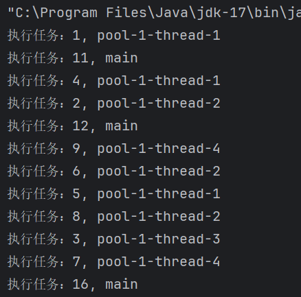 public class Demo_905 {public static void main(String[] args) throws InterruptedException {// 定义一个线程池ThreadPoolExecutor threadPool = new ThreadPoolExecutor(3,5, 1, TimeUnit.SECONDS,new LinkedBlockingQueue<>(5),new ThreadPoolExecutor.CallerRunsPolicy());// 通过循环向线程池中提交任务for (int i = 0; i < 100; i++) {int taskId = i + 1;threadPool.submit(() -> {System.out.println("执行任务:" + taskId + ", " + Thread.currentThread().getName());});}}
