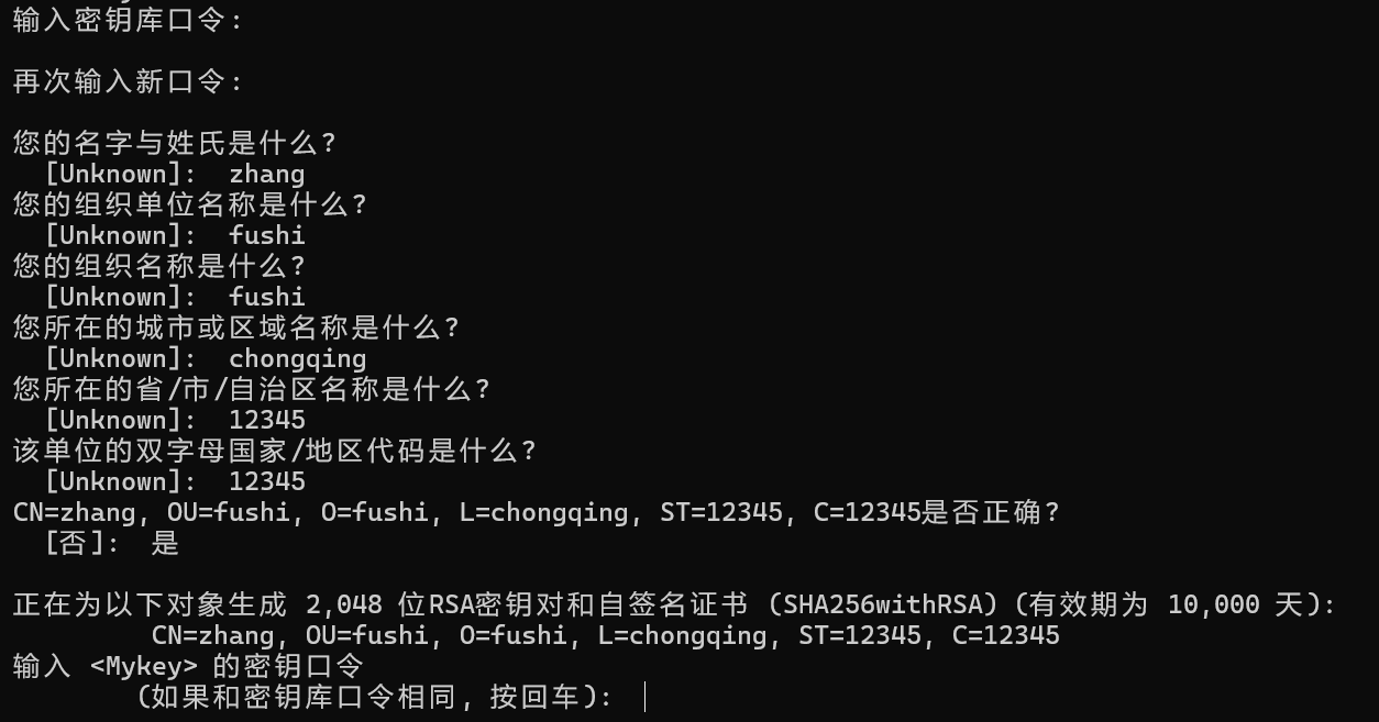 输入密匙口令MyKey和密码以及确认密码,密码为刚刚获取证书是输入的密码