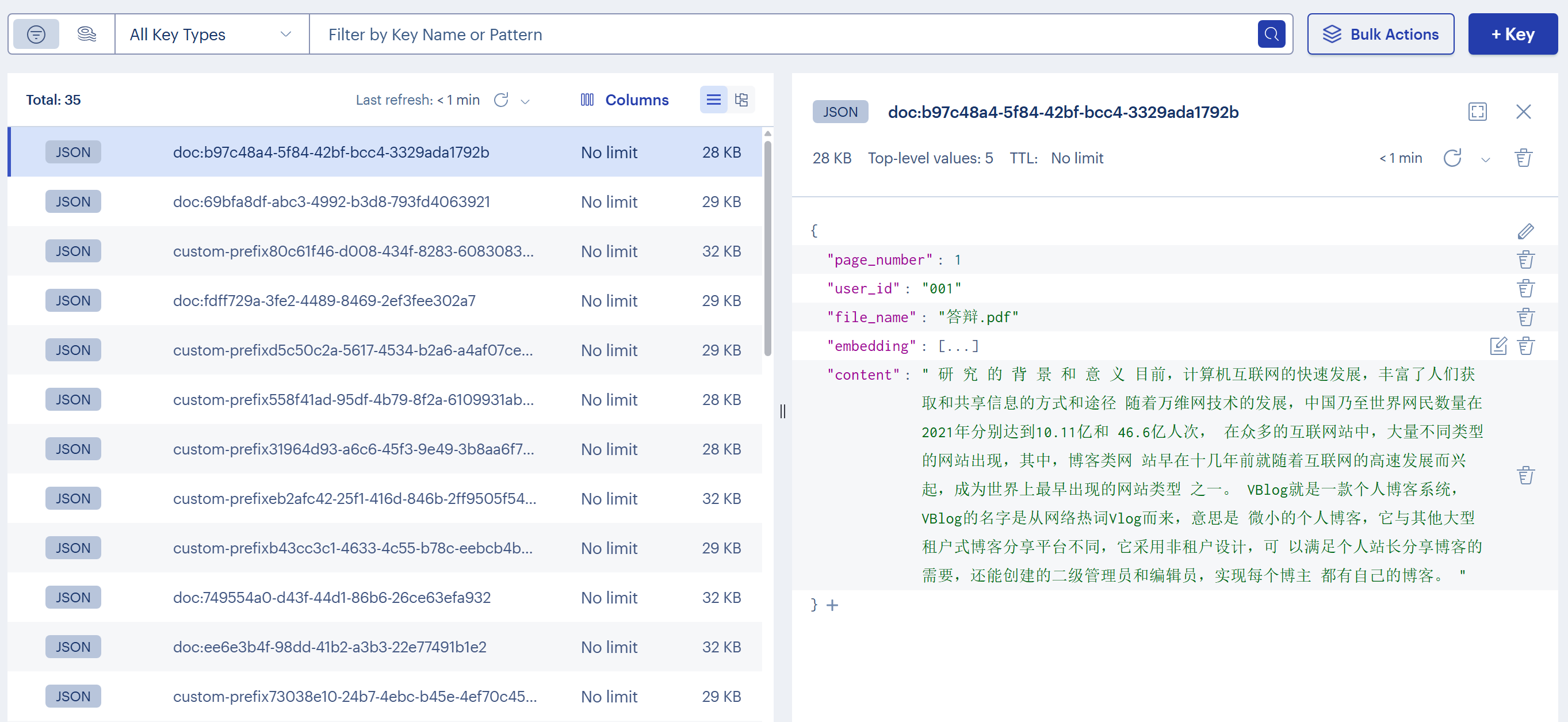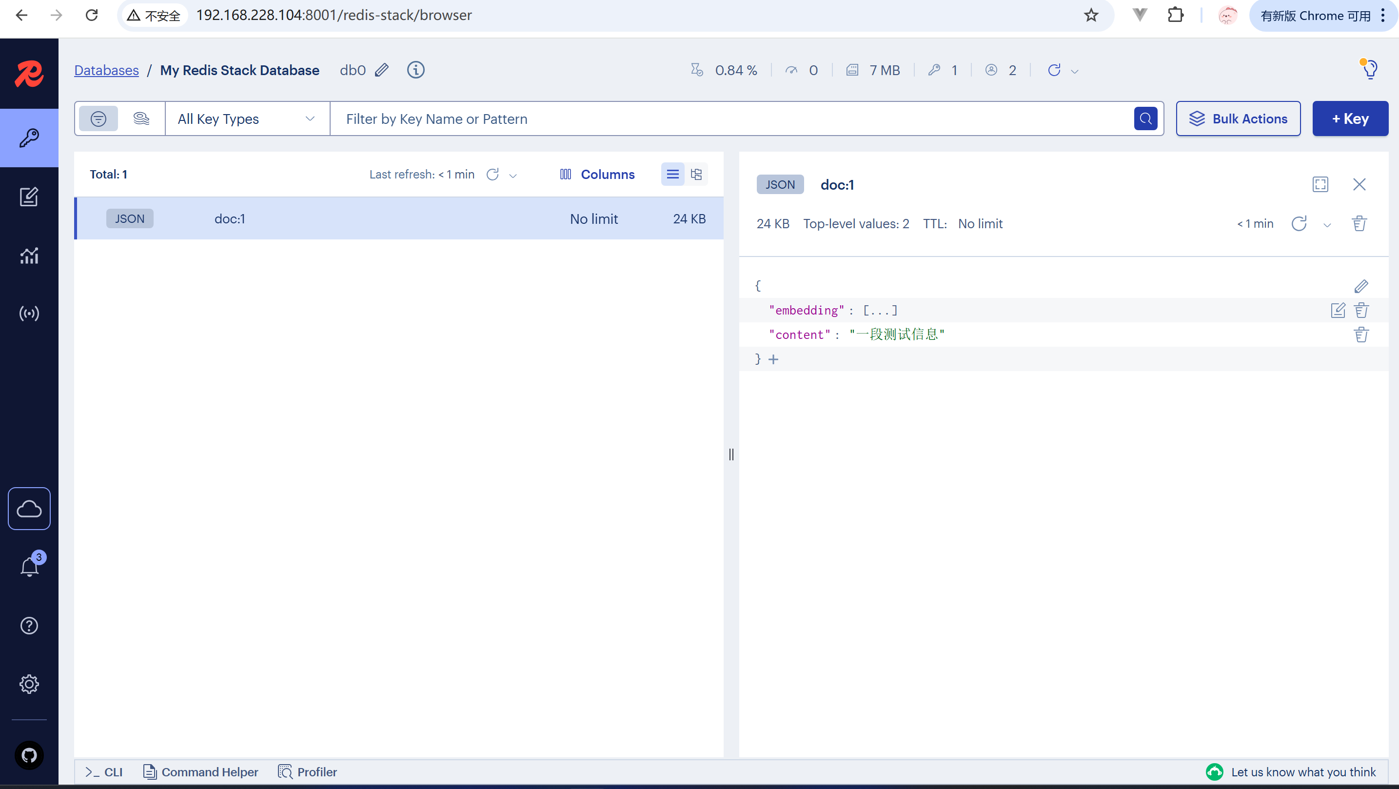 打开8001端口的redis-stack管理页面,可以看到文本数据及转换后的向量数据保存到了redis-stack中