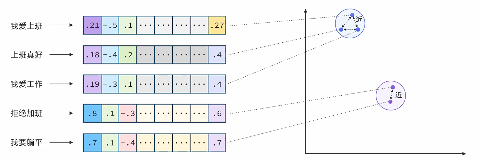 计算机中的数据都是以数字的形式进行存储,如果根据内容含义将文字数据转换成空间中的坐标,就成功把文字信息向量化了,含义相似的文本,转换为点的距离越近,通过对比向量相似度即可获得语义相近的内容。