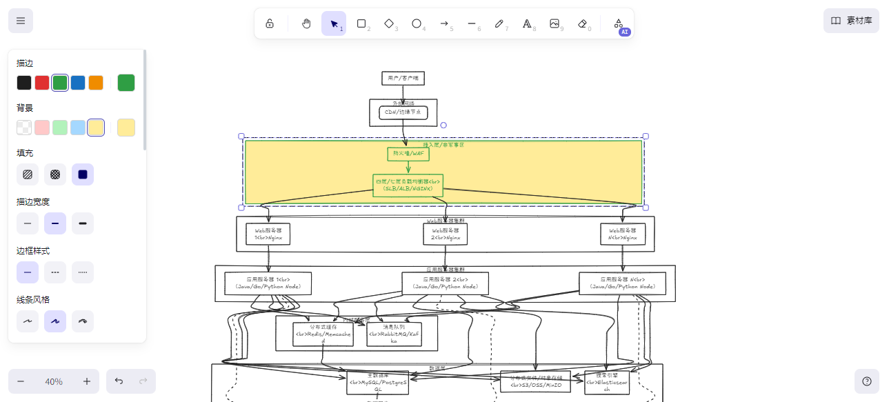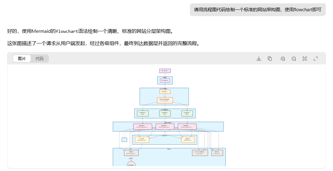 先用AI生成一个流程图,演示了一个网站“从用户访问到最底层的一个链路”: