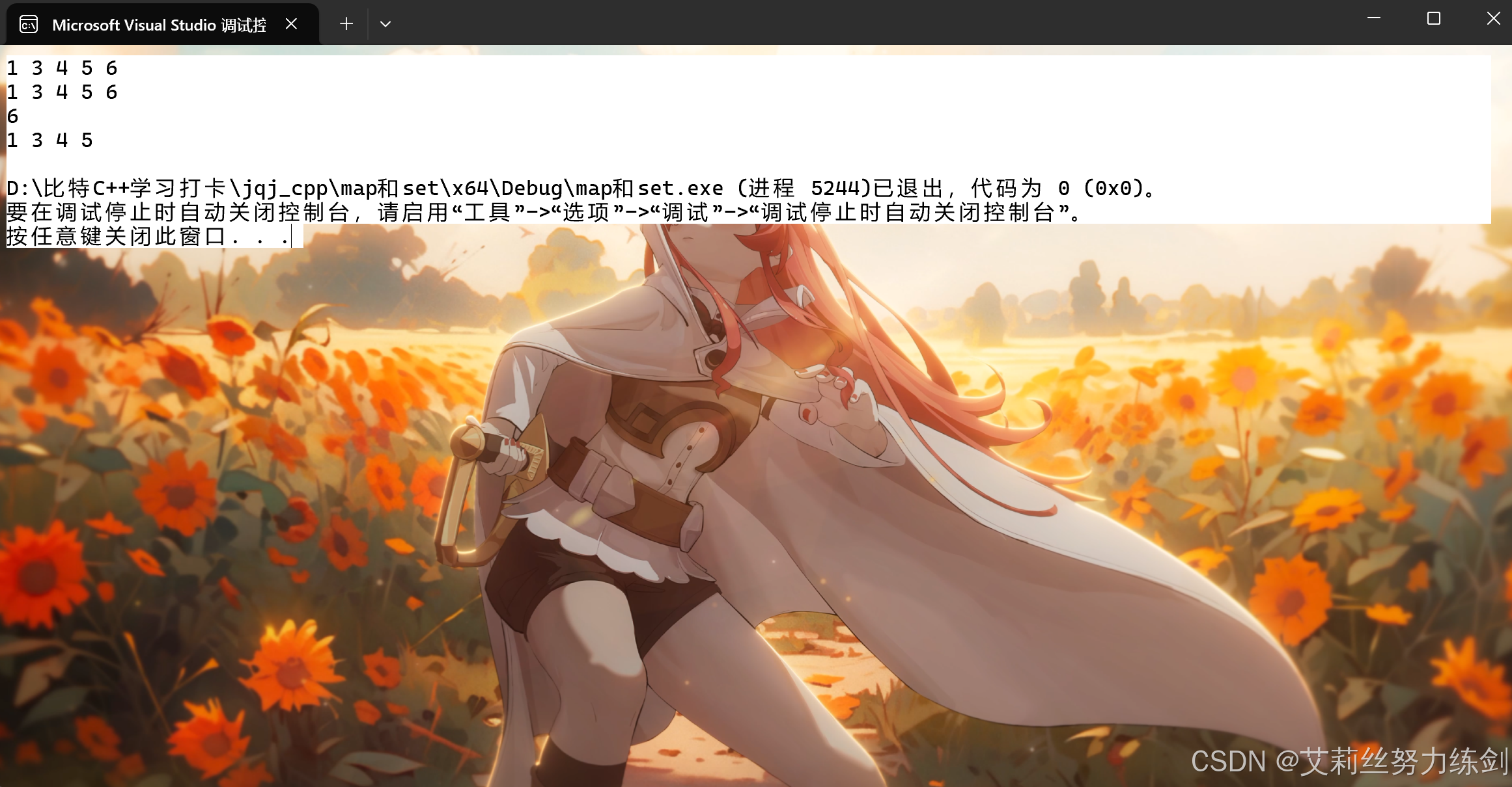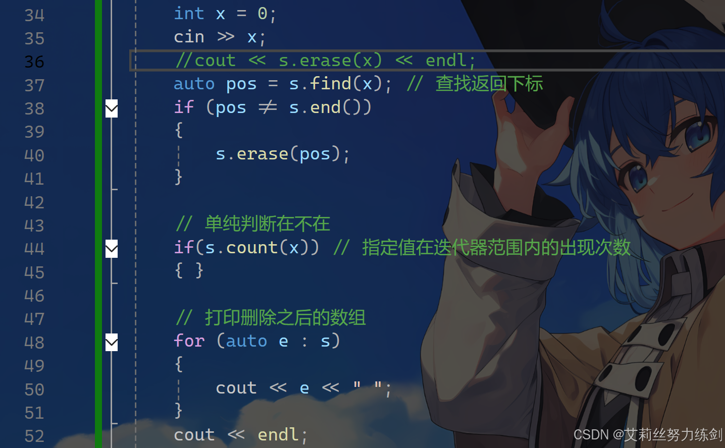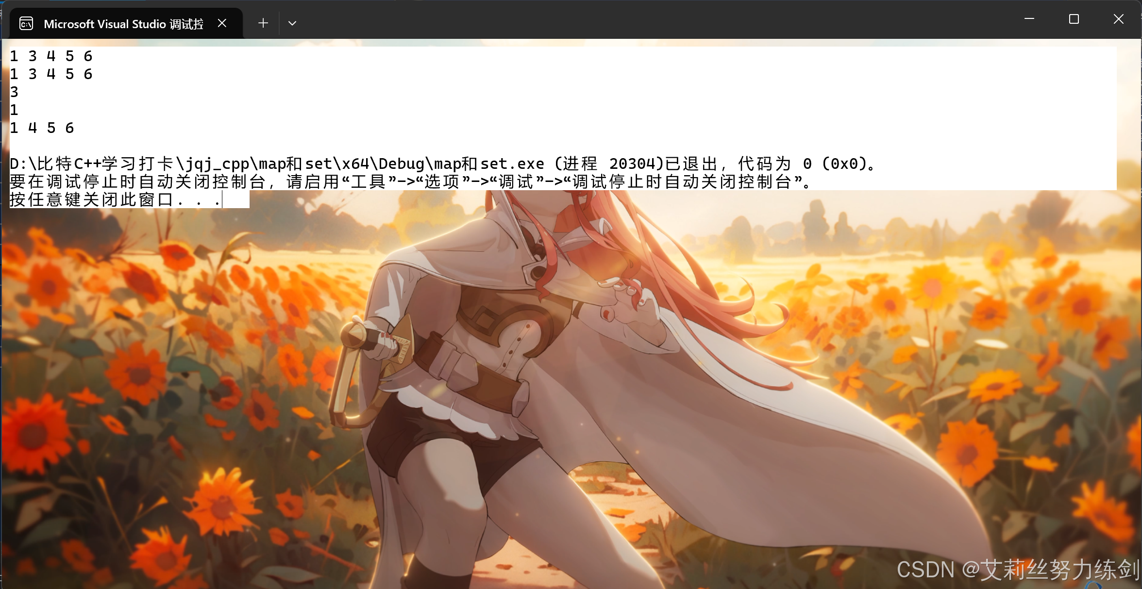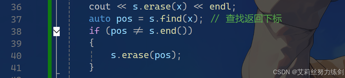 {set<int> s;s.insert(1);s.insert(3);s.insert(4);s.insert(6);s.insert(5);s.insert(3);s.insert(6);// 遍历结果:去重(set)+ 有序set<int>::iterator it = s.begin();while (it != s.end()){//*it = 1; // 报错不准确,不是常量的问题,而是不能修改*it,it可以修改cout << *it << " ";++it;}cout << endl;for (auto e : s){cout << e << " ";}cout << endl;int x = 0;cin >> x;cout << s.erase(x) << endl;auto pos = s.find(x); // 查找返回下标if (pos != s.end()){s.erase(pos);}// 单纯判断在不在if(s.count(x)){ }// 打印删除之后的数组for (auto e : s){cout << e << " ";}cout << endl;// 输出:// 1 3 4 5 6// 1 3 4 5 6// 输入:// 6// 输出:// 1// 1 3 4 5