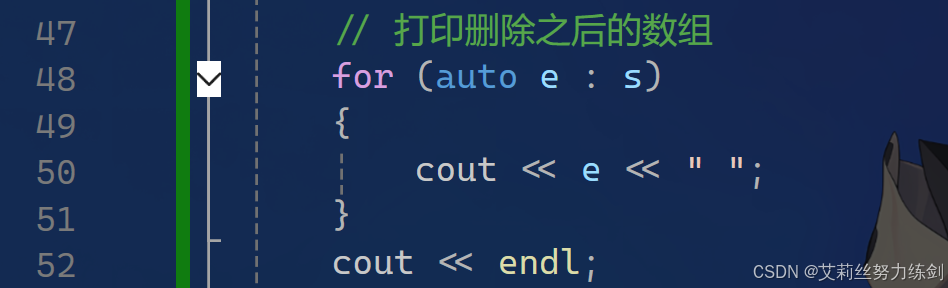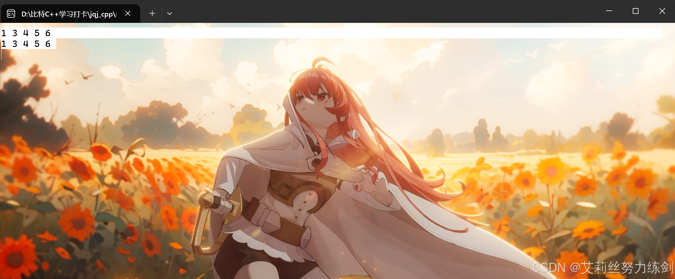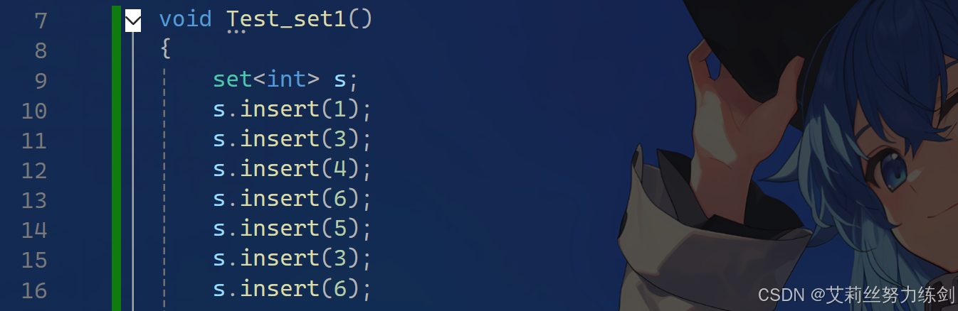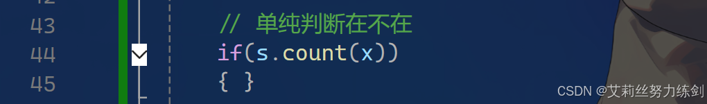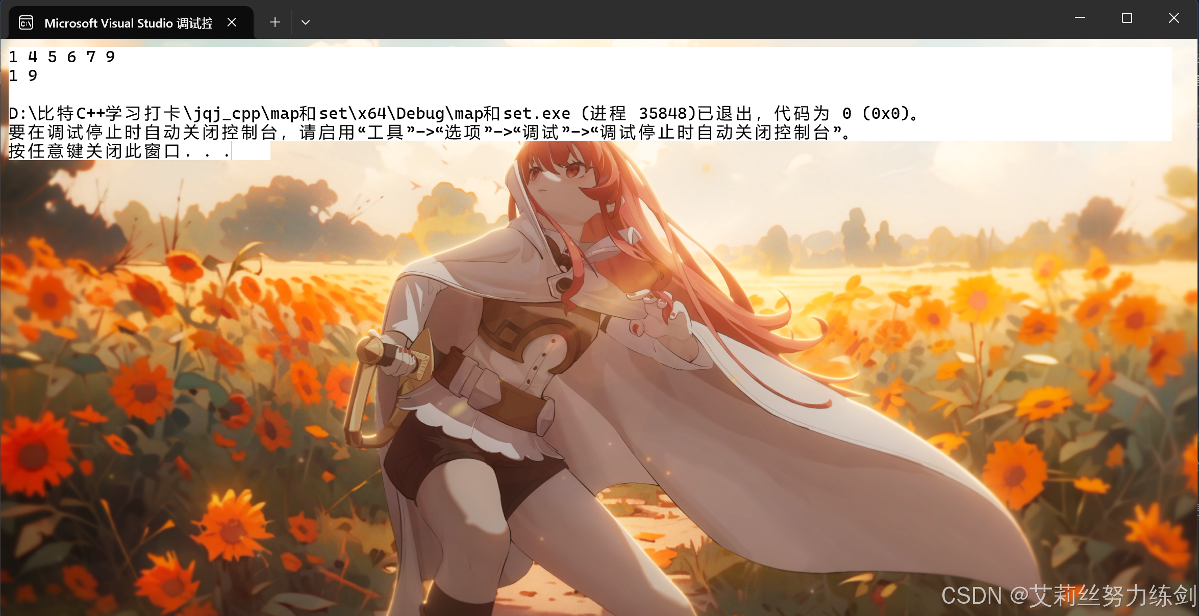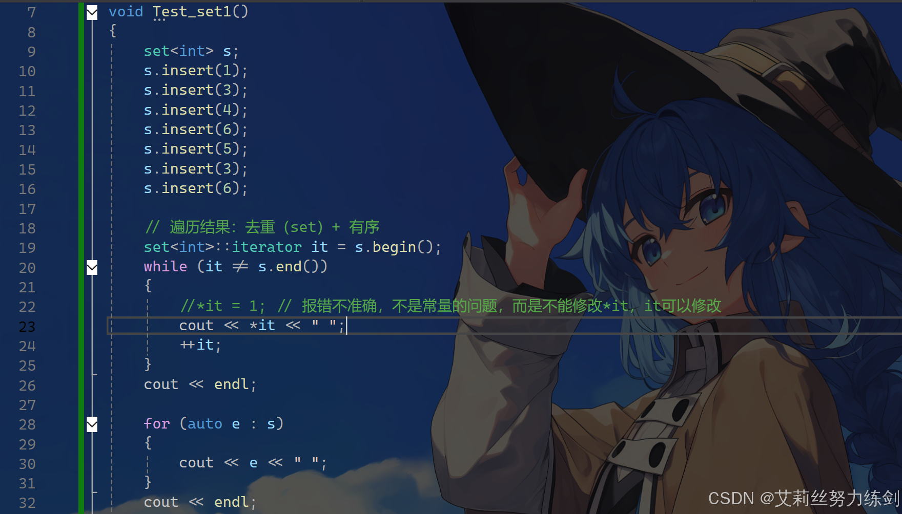 {set<int> s;s.insert(1);s.insert(3);s.insert(4);s.insert(6);s.insert(5);s.insert(3);s.insert(6);// 遍历结果:去重(set)+ 有序set<int>::iterator it = s.begin();while (it != s.end()){//*it = 1; // 报错不准确,不是常量的问题,而是不能修改*it,it可以修改cout << *it << " ";++it;}cout << endl;for (auto e : s){cout << e << " ";}cout << endl;int x = 0;cin >> x;cout << s.erase(x) << endl;auto pos = s.find(x); // 查找返回下标if (pos != s.end()){s.erase(pos);}// 单纯判断在不在if(s.count(x)){ }// 打印删除之后的数组for (auto e : s){cout << e << " ";}cout << endl;// 输出:// 1 3 4 5 6// 1 3 4 5 6// 输入:// 6// 输出:// 1// 1 3 4 5