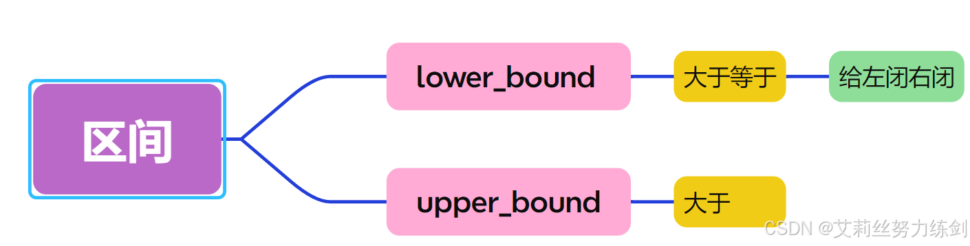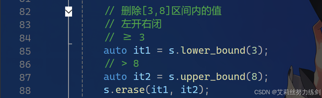 {// 假设区间的最左段的3被注释掉了——直接从4开始set<int> s;s.insert(1);//s.insert(3);s.insert(4);s.insert(6);s.insert(5);//s.insert(3);s.insert(6);s.insert(7);s.insert(9);for (auto e : s){cout << e << " ";}cout << endl;// 删除[3,8]区间内的值// 左开右闭// >= 3auto it1 = s.lower_bound(3);// > 8auto it2 = s.upper_bound(8);s.erase(it1, it2);for (auto e : s){cout << e << " ";}cout << endl;
