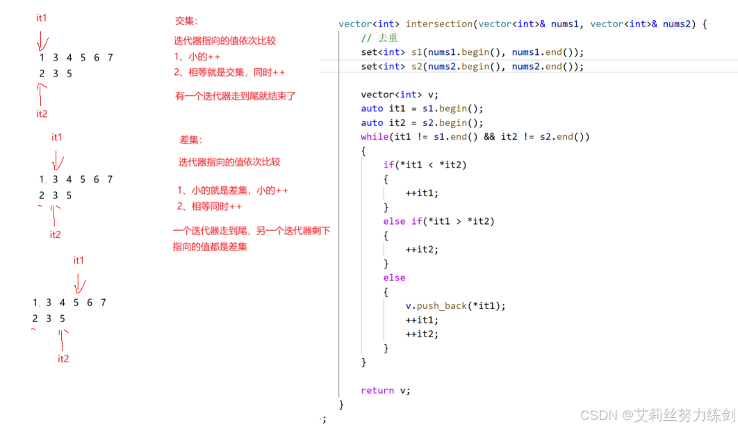 public:vector<int> intersection(vector<int>& nums1, vector<int>& nums2) {// 去重set<int> s1(nums1.begin(),nums1.end());set<int> s2(nums2.begin(),nums2.end());vector<int> v;auto it1 = s1.begin();auto it2 = s2.begin();while(it1 != s1.end() && it2 != s2.end()){if(*it1 < *it2){it1++;}else if(*it1 > *it2){it2++;}else{v.push_back(*it1);++it1;++it2;}}return v;}