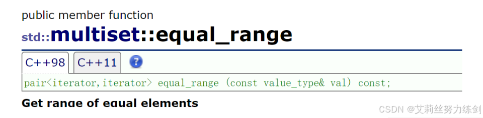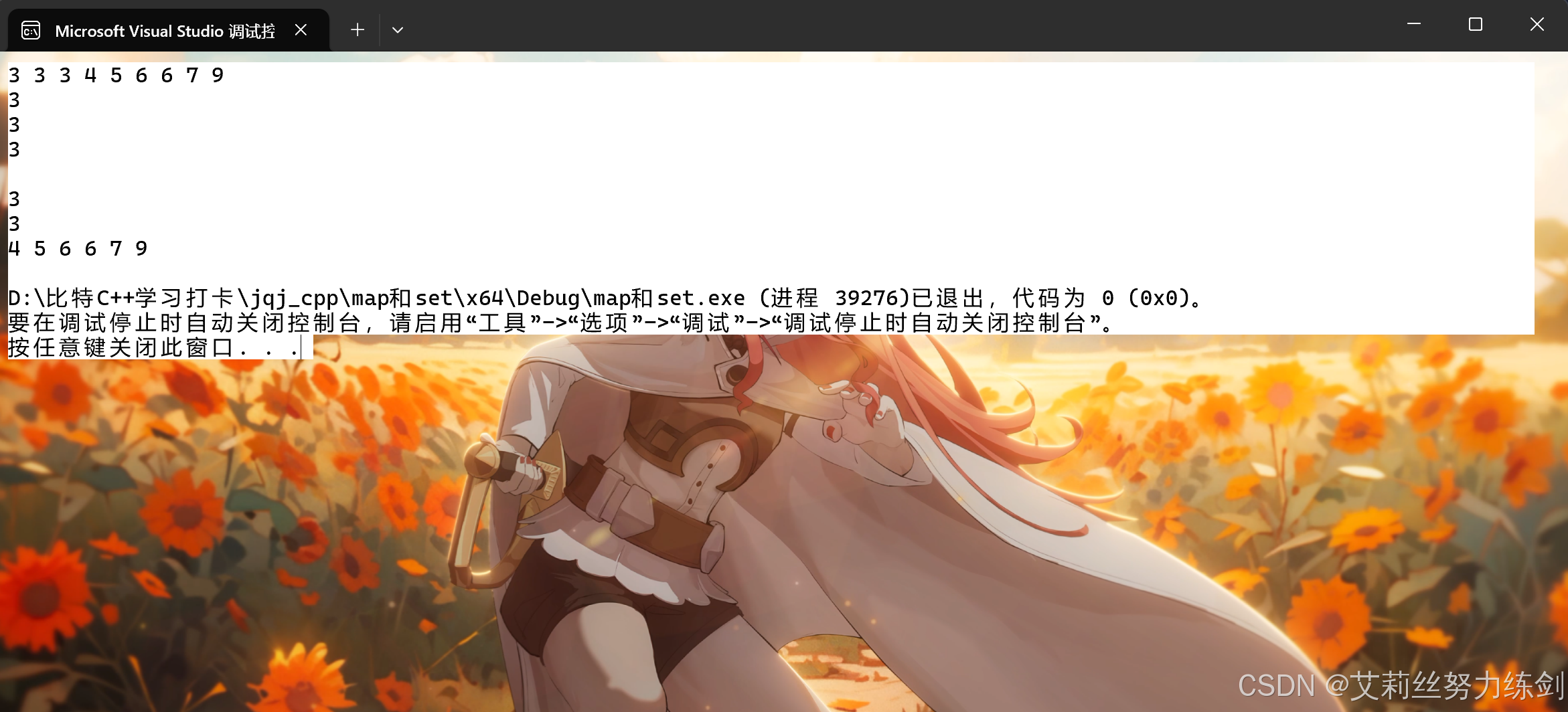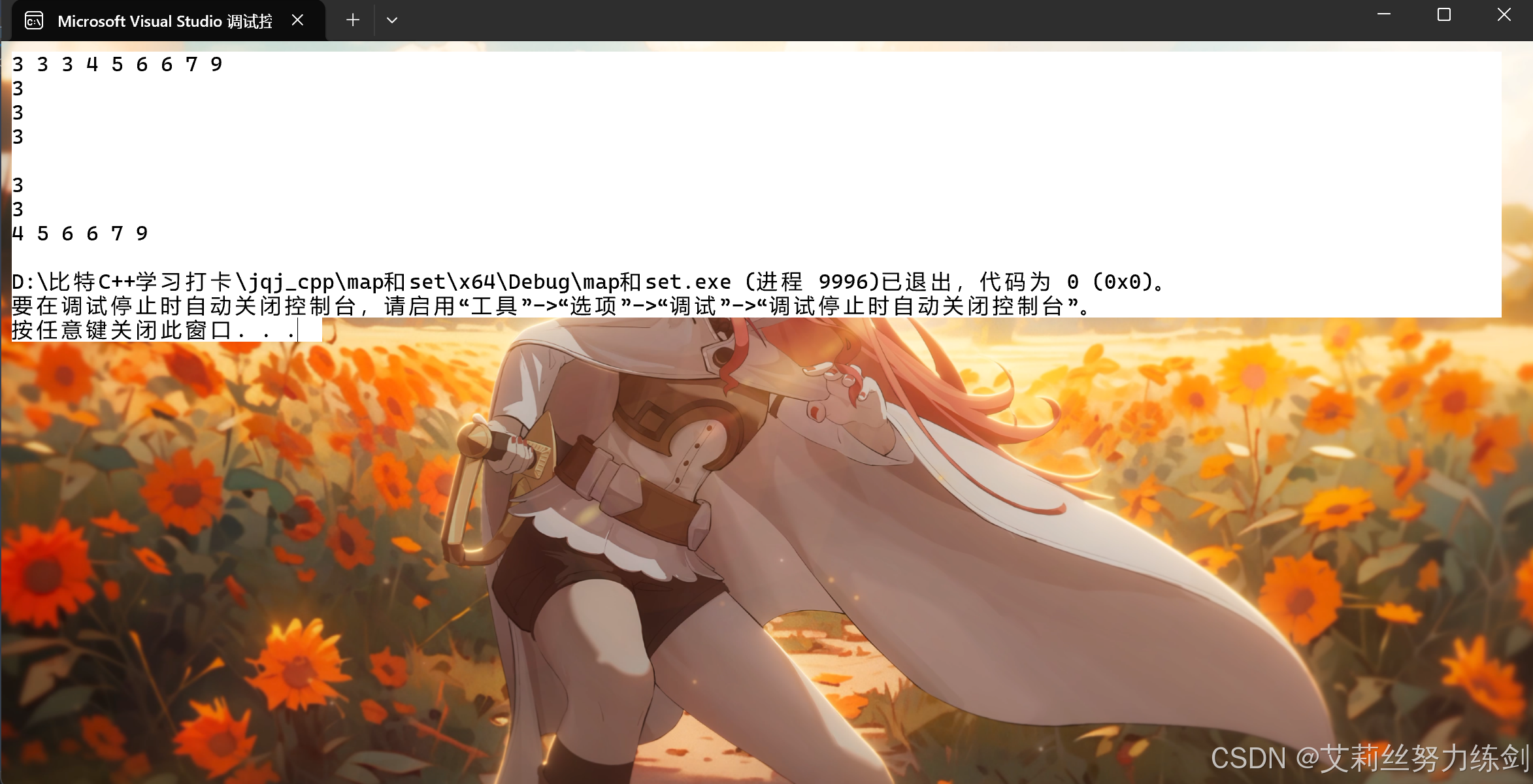 {multiset<int> s;s.insert(3);s.insert(4);s.insert(6);s.insert(5);s.insert(3);s.insert(6);s.insert(7);s.insert(9);s.insert(3);// 遍历结果:去重set<int>::iterator it = s.begin();while (it != s.end()){//*it = 1; // 报错不准确,不是常量的问题,而是不能修改*it,it可以修改cout << *it << " ";++it;}cout << endl;// 查找中序遍历中第一个3auto pos = s.find(3);while (pos != s.end() && *pos == 3){cout << *pos << endl;pos++;}cout << endl;// [) —— 左闭右开//std::pair<multiset<int>::iterator, multiset<int> ::iterator> ret = s.equal_range(3); //// 返回左闭右开的区间auto ret = s.equal_range(3);cout << s.count(3) << endl;cout << s.erase(3) << endl; // 删除所有3for (auto e : s){cout << e << " ";}cout << endl;