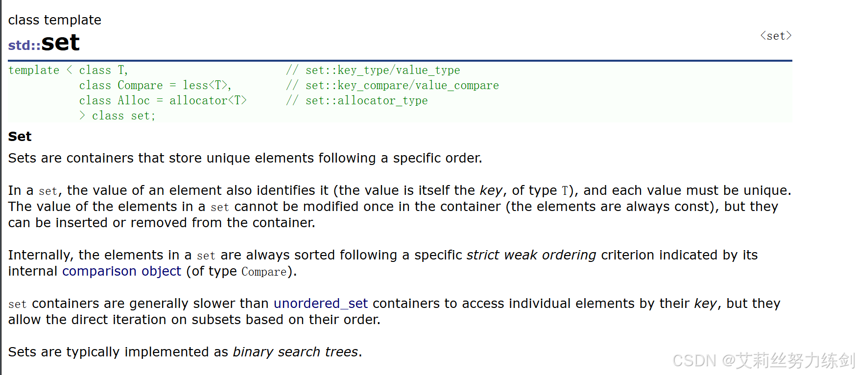 template < class T, // set::key_type/value_typeclass Compare = less<T>, // set::key_compare/value_compareclass Alloc = allocator<T> // set::allocator_type> class set;
