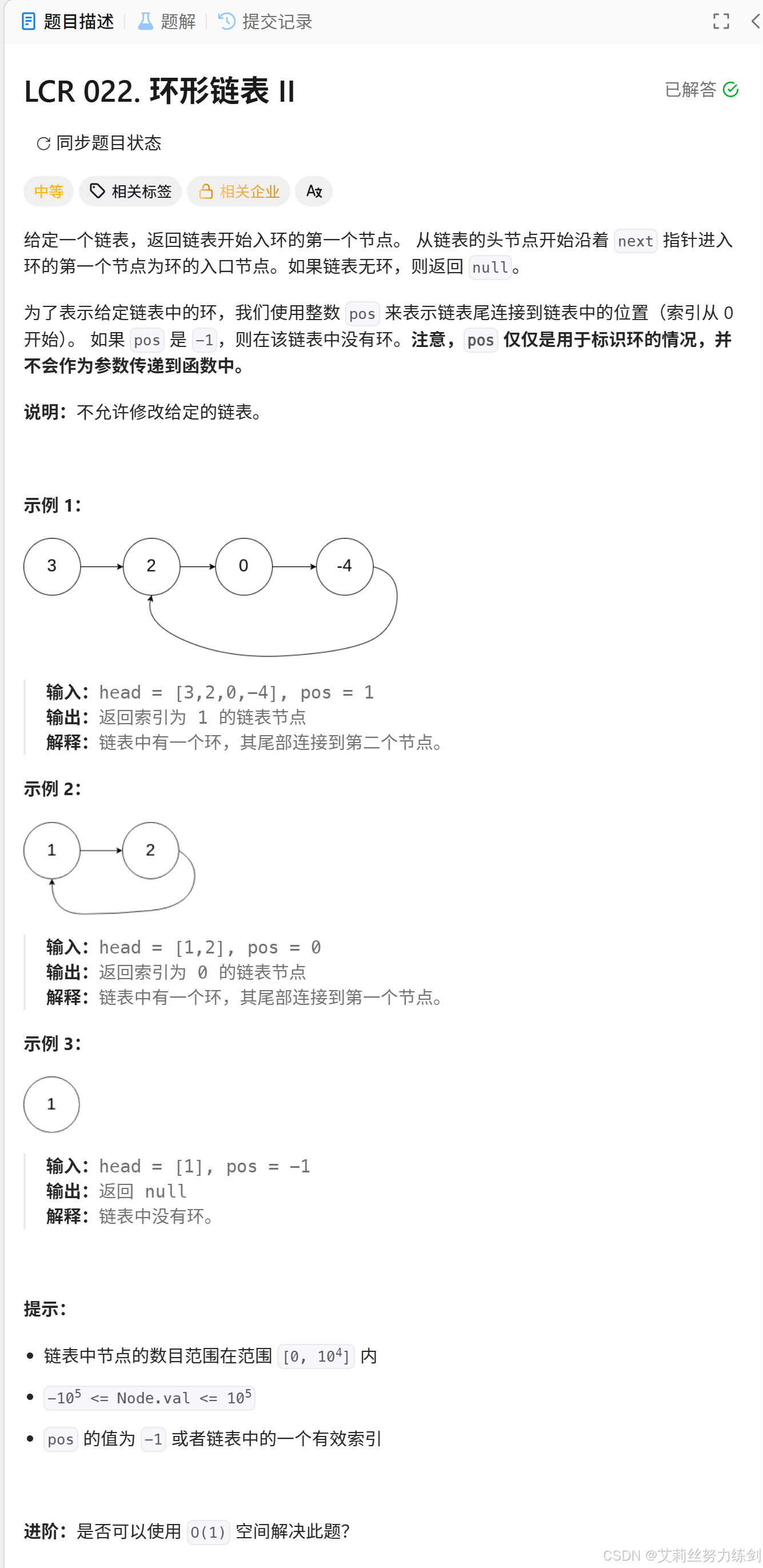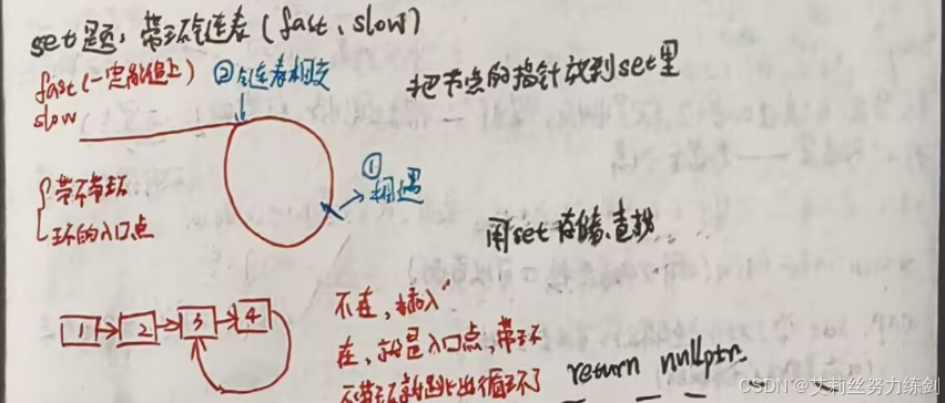 public:ListNode *detectCycle(ListNode *head) {set<ListNode*> s;ListNode* cur = head;while(cur){auto it = s.find(cur);if(it == s.end()){s.insert(cur); // 不在,插入}else{return *it;}cur = cur->next;}return nullptr;}