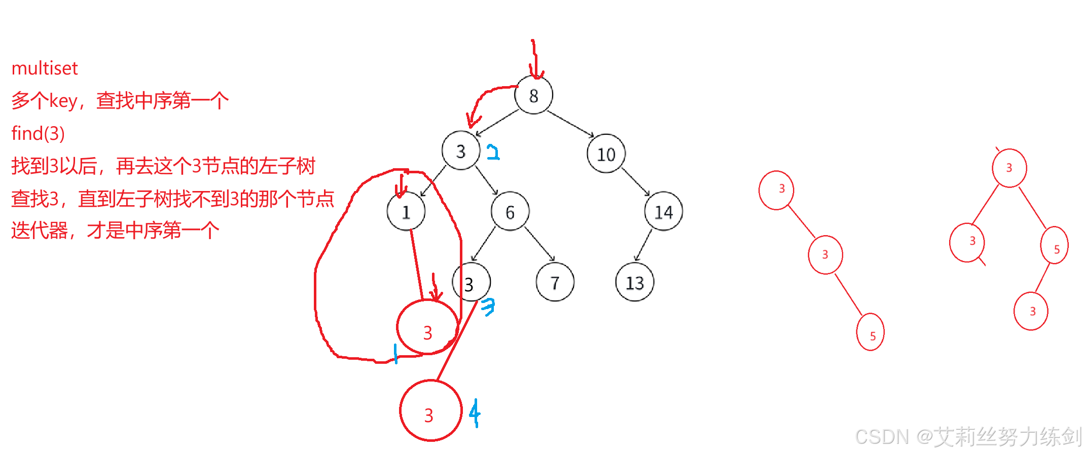 比如查找3这个节点,如果有多个3节点,会查找中序遍历的第一个3节点——