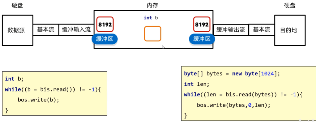 字节缓冲流:底层自带了长度为8192的缓冲区提高性能