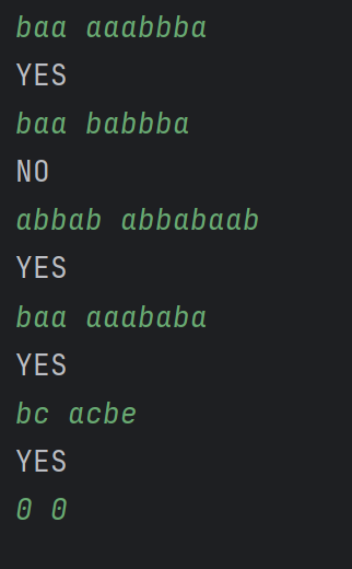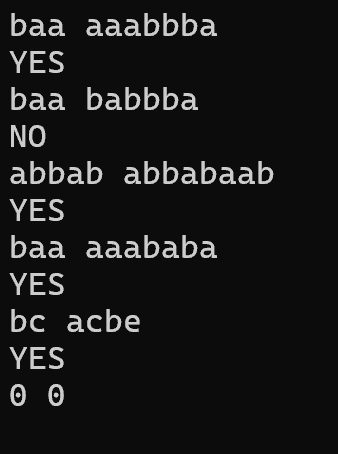 def index_bf(S, T, pos):"""暴力匹配算法(还原C++逻辑):param S: 主串(树木DNA,0-based字符串):param T: 模式串(病毒DNA的某个旋转,0-based字符串):param pos: 匹配起始位置(1-based):return: 匹配成功返回1-based起始位置,失败返回0"""len_S = len(S)len_T = len(T)# 非法输入判断(模式串为空或起始位置越界)if len_T == 0 or pos < 1 or pos > len_S:return 0i = pos - 1 # 转换为主串0-based索引j = 0 # 模式串0-based索引while i < len_S and j < len_T:if S[i] == T[j]:i += 1j += 1else:# 回溯:主串回到上次匹配起始位置+1,模式串重置i = i - j + 1j = 0# 模式串完全匹配,返回1-based起始位置if j == len_T:return i - len_T + 1# 匹配失败return 0def double_circular_sequence(s):"""将环状序列倍增(还原C++逻辑),如"baa"→"baabaa",覆盖所有旋转情况"""return s + sdef match_circular_pattern(main_str, doubled_pattern):"""匹配环状模式串的所有旋转形式:param main_str: 主串(树木DNA):param doubled_pattern: 倍增后的模式串(病毒DNA):return: 存在匹配返回True,否则返回False"""m = len(doubled_pattern) // 2 # 病毒DNA原始长度# 遍历所有旋转情况(提取倍增串中长度为m的子串)for i in range(m):pattern = doubled_pattern[i:i+m]# 调用暴力匹配,从主串第1个字符开始if index_bf(main_str, pattern, 1) > 0:return Truereturn Falsedef virus_detection():"""主函数:读取输入并检测病毒DNA"""while True:# 读取一行输入并分割(处理可能的空行和多空格)line = input().strip()while not line: # 跳过空行line = input().strip()temp1, temp2 = line.split()# 终止条件:两个输入均为"0"if temp1 == "0" and temp2 == "0":break# 处理病毒串和树木串virus = temp1tree = temp2# 倍增病毒串(生成所有旋转的候选子串)doubled_virus = double_circular_sequence(virus)# 检测是否存在匹配的旋转形式if match_circular_pattern(tree, doubled_virus):print("YES")else:print("NO")if __name__ == "__main__":virus_detection()