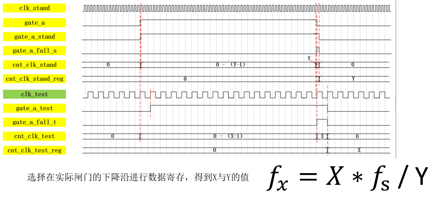 ④将已知量标准时钟信号频率fs和测量值X,Y带入公式,即可得到被测时钟信号频率fx。