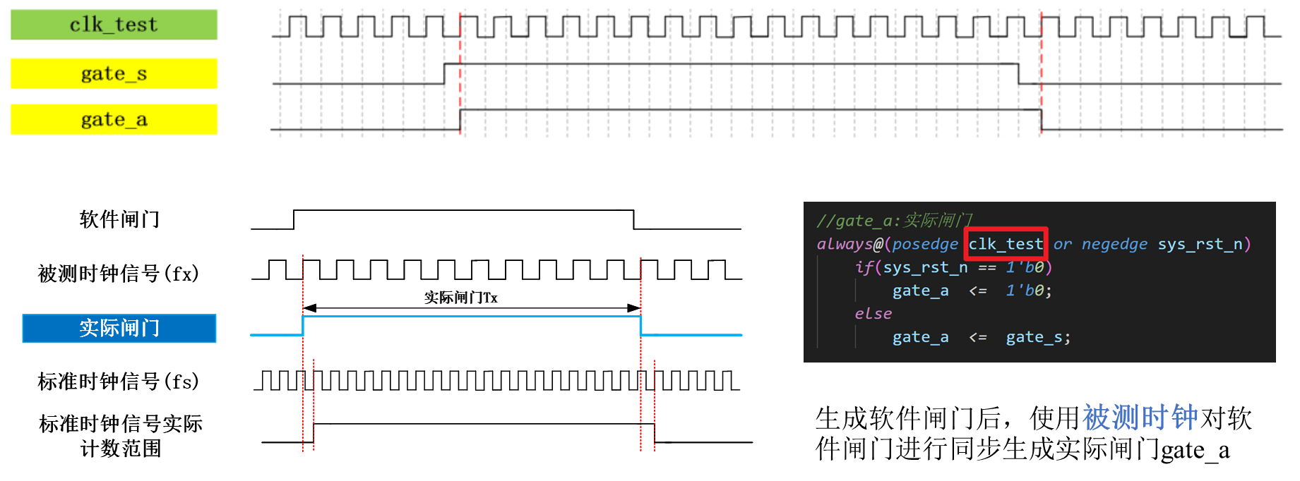 生成软件闸门后,使用被测时钟对软件闸门进行同步生成实际闸门gata_a,波形图如下: