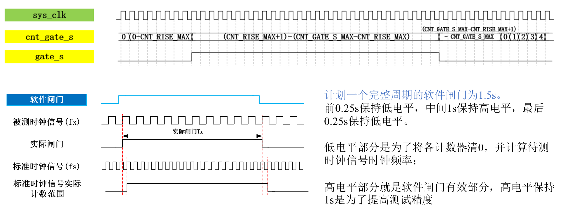 低电平部分是为了将各计数器清0,并计算待测时钟信号的频率;高电平部分就是软件闸门的有效部分。