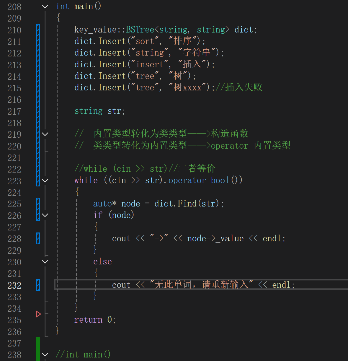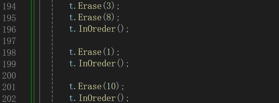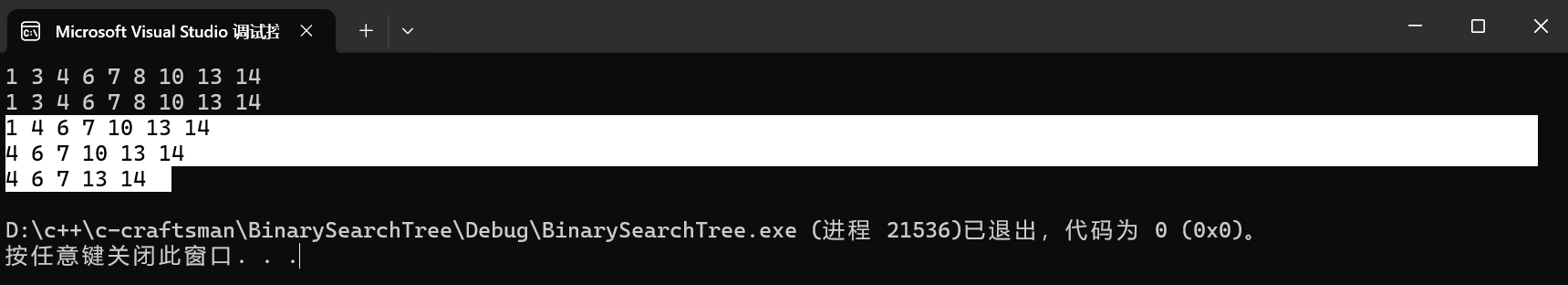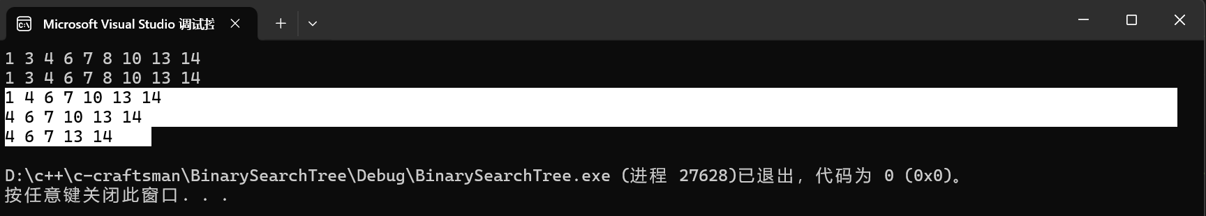 {int a[] = { 8,3,1,10,1,6,4,7,14,13 }; // 给一个数组BSTree<int> t; // 定义一棵树for (auto e : a) // 数组也支持访问for{t.Insert(e); // 把数据插入进去}t.InOrder(); // C++递归很麻烦,这里要传根,但是根是私有的// 打印结果:1 3 4 6 7 8 10 13 14(成功,并且是有序的——中序遍历)// 这样基本上说明插入是没问题的t.Find(1);t.InOrder();t.Erase(3); // 没啥问题t.Erase(8);t.InOrder();t.Erase(1); // 没啥问题t.InOrder();t.Erase(10); // 左为空t.InOrder();for (auto e : a) // 需要全部再删一次,重复删不会报错{t.Insert(e);}return 0;
