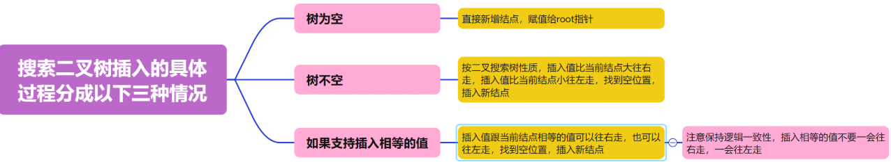 - 树不空,按二叉搜索树性质,插入值比当前结点大就往右走,插入值比当前结点小就往左走,找到空位置,插入新结点