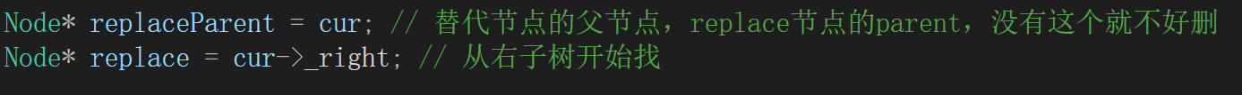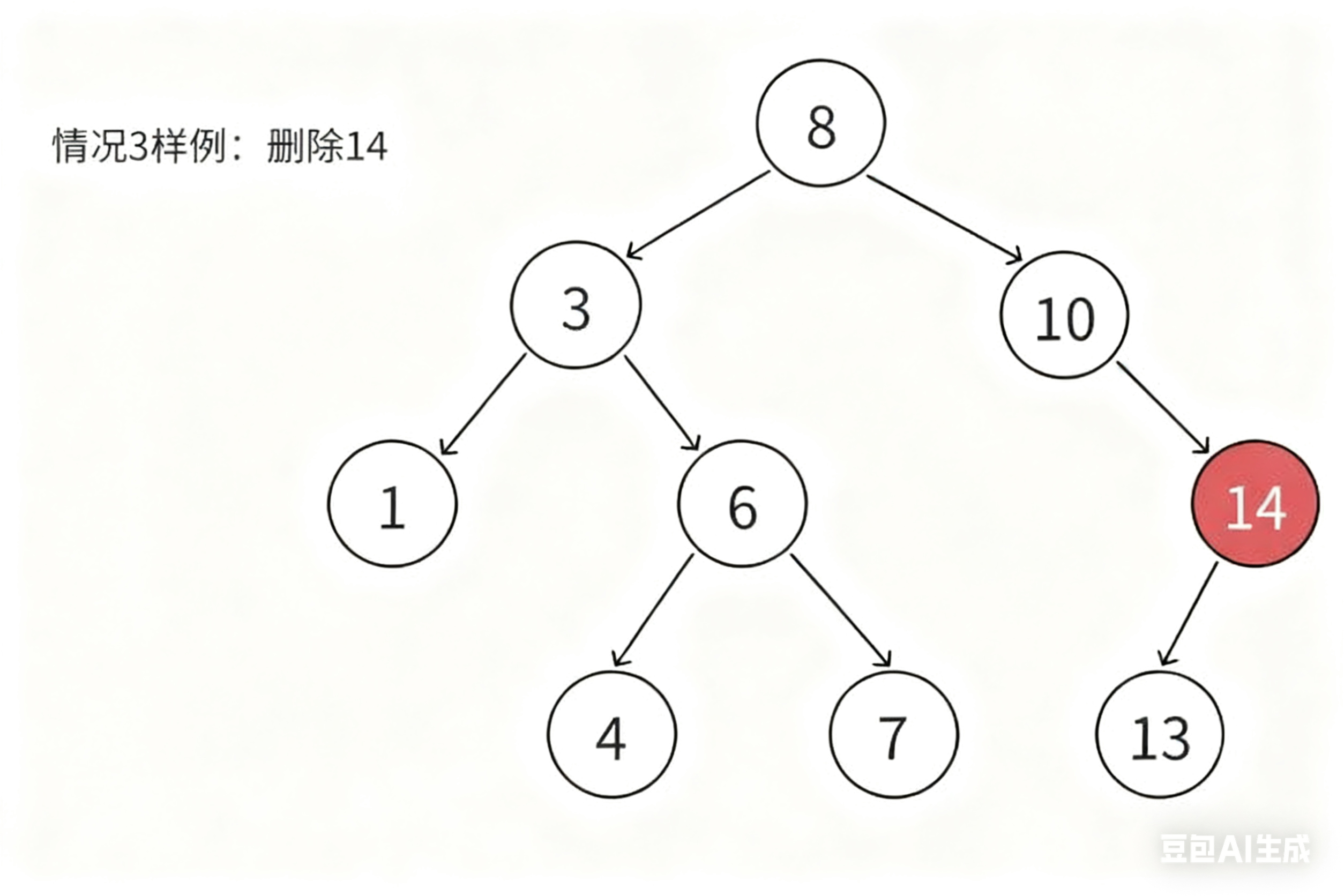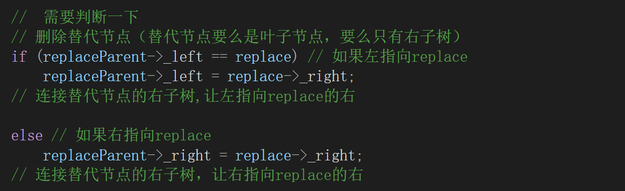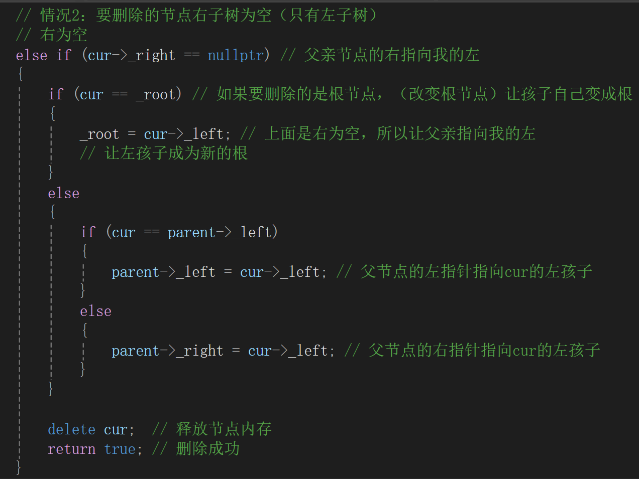 // 搜索二叉树这个部分,删除是很麻烦的,先找到再删除,找到不难,但是删除很难// 面试如果考,一定不会考插入、查找,肯定会考删除bool Erase(const K& key){Node* parent = nullptr; // 记录当前节点的父节点Node* cur = _root; // 从根节点开始搜索// 1、查找要删除的节点while (cur){if (cur->_key < key) // 目标key比当前节点大,向右子树搜索{parent = cur;cur = cur->_right;}else if (cur->_key > key) // 目标key比当前节点小,向左子树搜索{parent = cur;cur = cur->_left;}else // 找到要删除的节点cur——要干掉的节点{// 情况1:要删除的节点左子树为空(只有右子树或没有子树)// 左为空if (cur->_left == nullptr) // 父亲节点的左指向我的右{//if (cur == parent->_left) // 13没删掉if (cur == _root) // 如果要删除的是根节点,(改变根节点)让孩子自己变成根{_root = cur->_right; // 上面是左为空,所以让父亲指向我的右// 让右孩子成为新的根}else{// 判断cur是父节点的左孩子还是右孩子if (cur == parent->_left) // 父亲节点的左指向我的右,父节点的左指针指向cur的右孩子{parent->_left = cur->_right; }else // 父亲节点的右指向我的左{parent->_right = cur->_right; // 父节点的右指针指向cur的右孩子}}delete cur; // 删除cur,释放节点内存return true; // 找到了,删除成功}// 情况2:要删除的节点右子树为空(只有左子树)// 右为空else if (cur->_right == nullptr) // 父亲节点的右指向我的左{if (cur == _root) // 如果要删除的是根节点,(改变根节点)让孩子自己变成根{_root = cur->_left; // 上面是右为空,所以让父亲指向我的左// 让左孩子成为新的根}else{if (cur == parent->_left) {parent->_left = cur->_left; // 父节点的左指针指向cur的左孩子}else{parent->_right = cur->_left; // 父节点的右指针指向cur的左孩子}}delete cur; // 释放节点内存return true; // 删除成功}// 情况3:要删除的节点左右子树都不为空(最复杂的情况!!!)else // 左右均不为空{// 策略:用右子树的最小节点(中序后继)来替代当前节点// 找cur右子树的最小节点替代Node* replaceParent = cur; // 替代节点的父节点,replace节点的parent,没有这个就不好删Node* replace = cur->_right; // 从右子树开始找// 在右子树中一直向左找,找到最小的节点(最左节点)while (replace->_left) // 找最左节点,不为空就继续,等于空就找到了{replaceParent = replace; // 把replace给过去,每次都给replace = replace->_left; // 左不为空,就不断往左边找}// 用替代节点的值覆盖要删除节点的值cur->_key = replace->_key; // 不需要交换,替代的本质是把replace节点的值传过去// 需要判断一下// 删除替代节点(替代节点要么是叶子节点,要么只有右子树)if (replaceParent->_left == replace) // 如果左指向replacereplaceParent->_left = replace->_right; // 连接替代节点的右子树,让左指向replace的右else // 如果右指向replacereplaceParent->_right = replace->_right; // 连接替代节点的右子树,让右指向replace的右delete replace; // 释放替代节点内存,彻底删除replacereturn true; // 删除成功}}}return false; // 没找到删除的节点,直接return false}