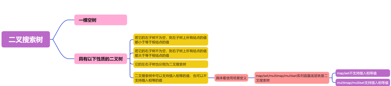 - 二叉搜索树中可以支持插入相等的值,也可以不支持插入相等的值,具体看使用场景定义