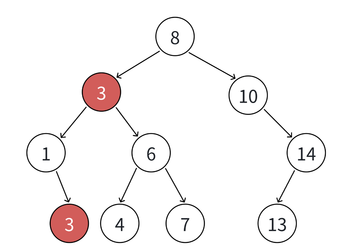 - 如果支持插入相等的值,意味着有多个x存在,一般要求查找中序的第一个x。如下图,查找3,要找到1的右孩子的那个3返回