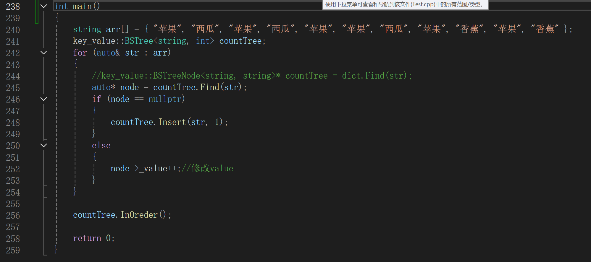 {template<class K>struct BSTreeNode{BSTreeNode<K>* _left;BSTreeNode<K>* _right;K _key;BSTreeNode(const K& key):_left(nullptr), _right(nullptr), _key(key){}};//不允许相等的值插入template<class K>class BSTree{typedef BSTreeNode<K> Node;public:bool Insert(const K& key){if (_root == nullptr){_root = new Node(key);return true;}Node* parent = nullptr;Node* cur = _root;while (cur){if (cur->_key < key){parent = cur;cur = cur->_right;}else if (cur->_key > key){parent = cur;cur = cur->_left;}else{return false;}}cur = new Node(key);if (parent->_key < key){parent->_right = cur;}else{parent->_left = cur;}return true;}bool Find(const K& key){Node* cur = _root;while (cur){if (cur->_key < key){cur = cur->_right;}else if (cur->_key > key){cur = cur->_left;}else{return true;}}return false;}//bool Erase(const K& key)//{// Node* parent = nullptr;// Node* cur = _root;// while (cur)// {// if (cur->_key < key)// {// parent = cur;// cur = cur->_right;// }// else if (cur->_key > key)// {// parent = cur;// cur = cur->_left;// }// else// {// //删除cur// if (cur->_left == nullptr)// {// if (cur == _root)// {// _root = cur->_right;// }// else// {// if (cur == parent->_left)// {// parent->_left = cur->_right;// }// else// {// parent->_right = cur->_right;// }// }// delete cur;// return true;// }// else if (cur->_right == nullptr)// {// if (cur == _root)// {// _root = cur->_left;// }// else// {// if (cur == parent->_left)// {// parent->_left = cur->_left;// }// else// {// parent->_right = cur->_left;// }// }// delete cur;// return true;// }// //左右均不为空// else// {// // 找cur右子树的最小节点替代// Node* replaceParent = cur;// Node* replace = cur->_right;// while (replace->_left)// {// replaceParent = replace;// replace = replace->_left;// }// cur->_key = replace->_key;// if (replaceParent->_left == replace)// replaceParent->_left = replace->_right;// else// replaceParent->_right = replace->_right;// delete cur;// return true;// }// }// }// return false;//}// 搜索二叉树这个部分,删除是很麻烦的,先找到再删除,找到不难,但是删除很难// 面试如果考,一定不会考插入、查找,肯定会考删除bool Erase(const K& key){Node* parent = nullptr; // 记录当前节点的父节点Node* cur = _root; // 从根节点开始搜索// 1、查找要删除的节点while (cur){if (cur->_key < key) // 目标key比当前节点大,向右子树搜索{parent = cur;cur = cur->_right;}else if (cur->_key > key) // 目标key比当前节点小,向左子树搜索{parent = cur;cur = cur->_left;}else // 找到要删除的节点cur——要干掉的节点{// 情况1:要删除的节点左子树为空(只有右子树或没有子树)// 左为空if (cur->_left == nullptr) // 父亲节点的左指向我的右{//if (cur == parent->_left) // 13没删掉if (cur == _root) // 如果要删除的是根节点,(改变根节点)让孩子自己变成根{_root = cur->_right; // 上面是左为空,所以让父亲指向我的右// 让右孩子成为新的根}else{// 判断cur是父节点的左孩子还是右孩子if (cur == parent->_left) // 父亲节点的左指向我的右,父节点的左指针指向cur的右孩子{parent->_left = cur->_right;}else // 父亲节点的右指向我的左{parent->_right = cur->_right; // 父节点的右指针指向cur的右孩子}}delete cur; // 删除cur,释放节点内存return true; // 找到了,删除成功}// 情况2:要删除的节点右子树为空(只有左子树)// 右为空else if (cur->_right == nullptr) // 父亲节点的右指向我的左{if (cur == _root) // 如果要删除的是根节点,(改变根节点)让孩子自己变成根{_root = cur->_left; // 上面是右为空,所以让父亲指向我的左// 让左孩子成为新的根}else{if (cur == parent->_left){parent->_left = cur->_left; // 父节点的左指针指向cur的左孩子}else{parent->_right = cur->_left; // 父节点的右指针指向cur的左孩子}}delete cur; // 释放节点内存return true; // 删除成功}// 情况3:要删除的节点左右子树都不为空(最复杂的情况!!!)else // 左右均不为空{// 策略:用右子树的最小节点(中序后继)来替代当前节点// 找cur右子树的最小节点替代Node* replaceParent = cur; // 替代节点的父节点,replace节点的parent,没有这个就不好删Node* replace = cur->_right; // 从右子树开始找// 在右子树中一直向左找,找到最小的节点(最左节点)while (replace->_left) // 找最左节点,不为空就继续,等于空就找到了{replaceParent = replace; // 把replace给过去,每次都给replace = replace->_left; // 左不为空,就不断往左边找}// 用替代节点的值覆盖要删除节点的值cur->_key = replace->_key; // 不需要交换,替代的本质是把replace节点的值传过去// 需要判断一下// 删除替代节点(替代节点要么是叶子节点,要么只有右子树)if (replaceParent->_left == replace) // 如果左指向replacereplaceParent->_left = replace->_right;// 连接替代节点的右子树,让左指向replace的右else // 如果右指向replacereplaceParent->_right = replace->_right;// 连接替代节点的右子树,让右指向replace的右delete replace; // 释放替代节点内存,彻底删除replacereturn true; // 删除成功}}}return false; // 没找到删除的节点,直接return false}//类里面的递归都要这样玩去,尤其是树的递归,因为树的递归传的都是根,都要套一层,void InOreder()//套一层,因为外面拿不到跟,里面可以,{_InOreder(_root);cout << endl;}private:void _InOreder(Node* root){if (root == nullptr)return;_InOreder(root->_left);//先递归访问左子树,传左子树的根cout << root->_key << ' ';//再看这个地方的值_InOreder(root->_right);//再递归访问右子树,传右子树的根}private:Node* _root = nullptr;};
