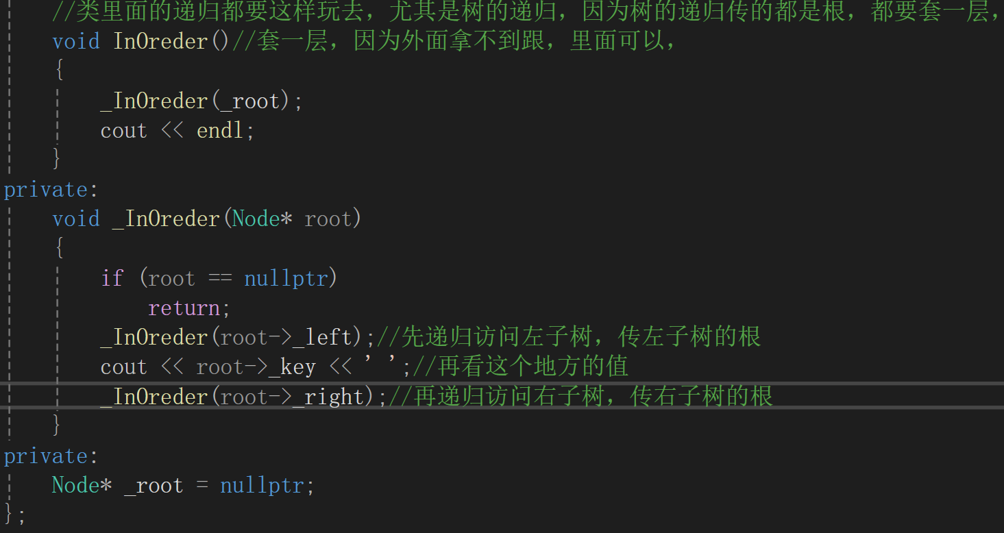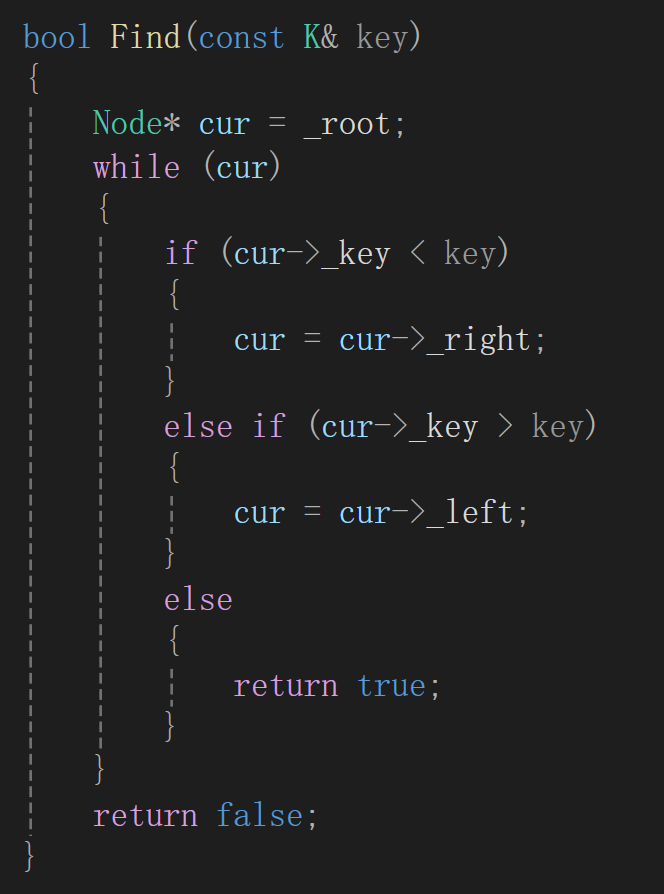 public:bool Insert(const K& key){if (_root == nullptr){_root = new Node(key);return true;}Node* parent = nullptr;Node* cur = _root;while (cur){if (cur->_key < key){parent = cur;cur = cur->_right;}else if (cur->_key > key){parent = cur;cur = cur->_left;}else{return false;}}cur = new Node(key);if (parent->_key < key){parent->_right = cur;}else{parent->_left = cur;}return true;}